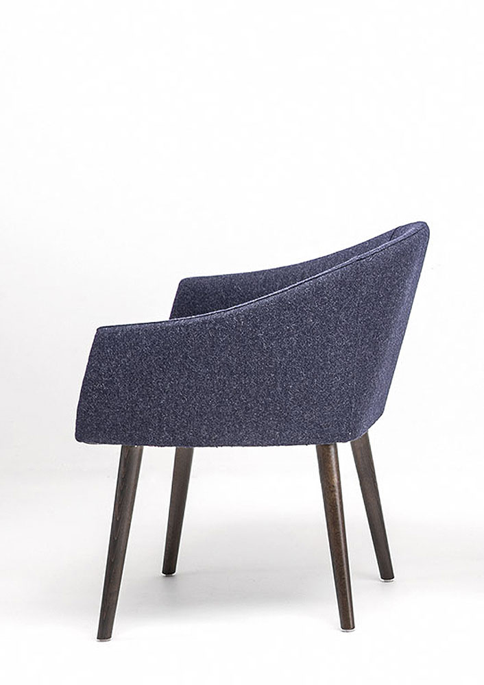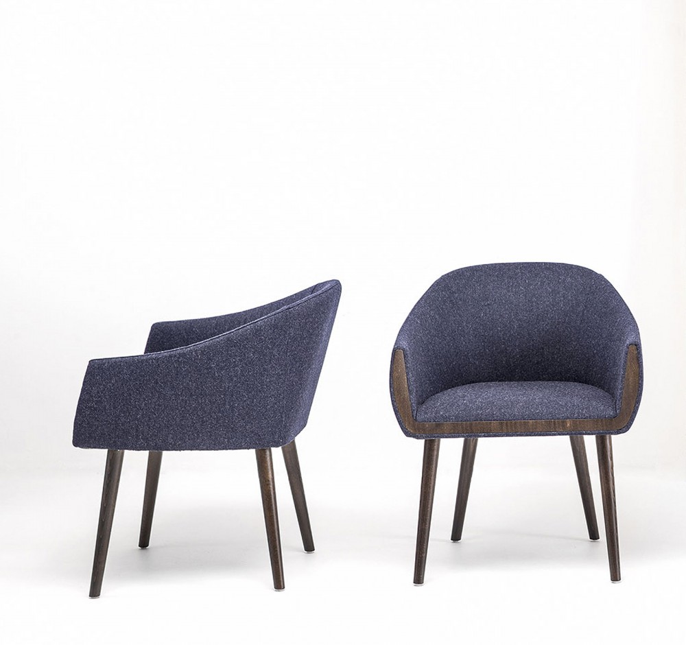 Poltroncina con scocca in poliuretano espanso ignifugo e indeformabile, rivestito in pelle o stoffa e base in faggio naturale, tinto o laccato.