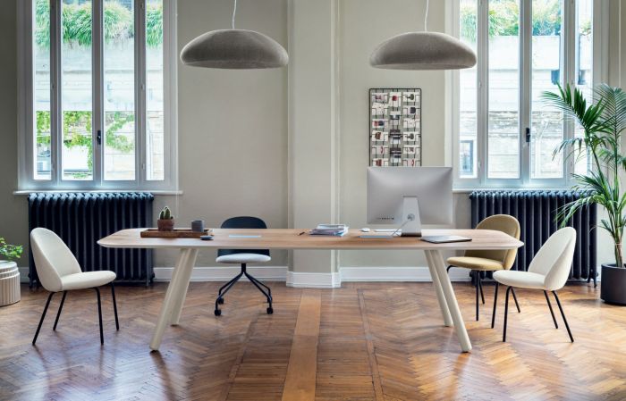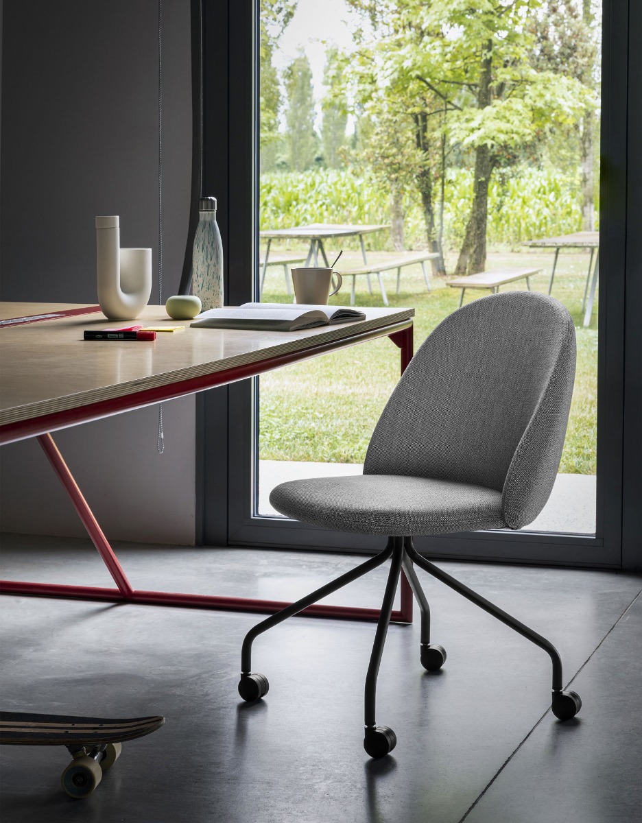 • Iola SD55: sedia con scocca in poliuretano flessibile stampato a freddo, rivestito nei tessuti elencati. Base a ragno con ruote, disponibile in grigio seta o antracite. L 52 x P 58 x H 83 cm (H seduta 46 cm)