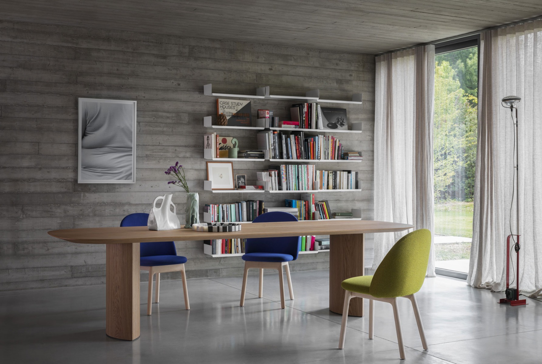 • Iola SD54: sedia con base in frassino naturale, frassino tinto nero o antracite. Scocca in poliuretano flessibile stampato a freddo, rivestita nei tessuti elencati. La sedia viene spedita smontata, con scocca separata dalla base. L 52 x P 58,2 x H 83 cm (H seduta 46,5 cm)