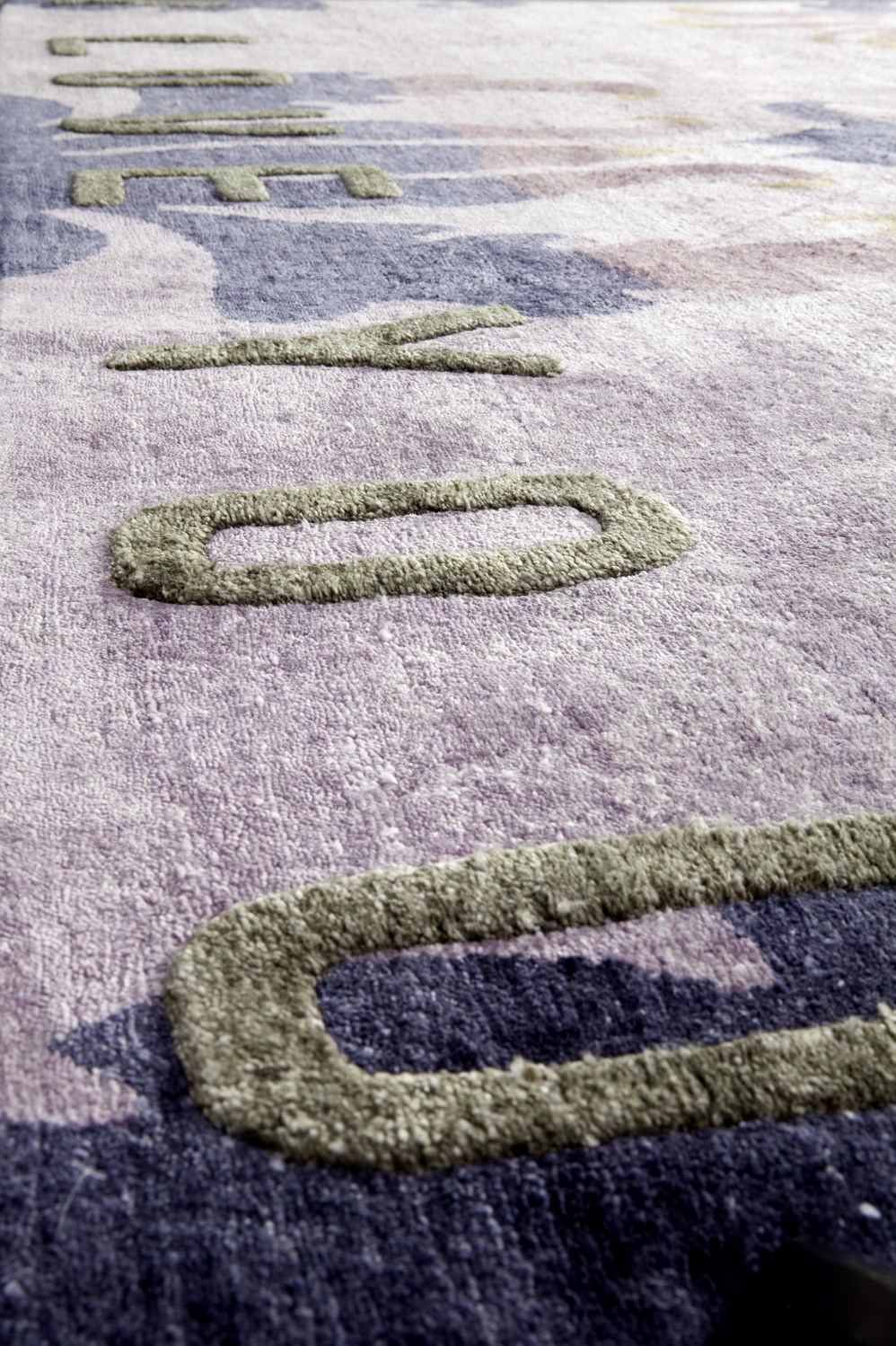 I love you di Erba è un tappeto annodato a mano con nodi tibetani (100 per pollice) su telaio verticale con due livelli di filato. La scritta “I Love you” è in rilievo. Composizione 100% seta di Bamboo, filato organico ed ecosostenibile.