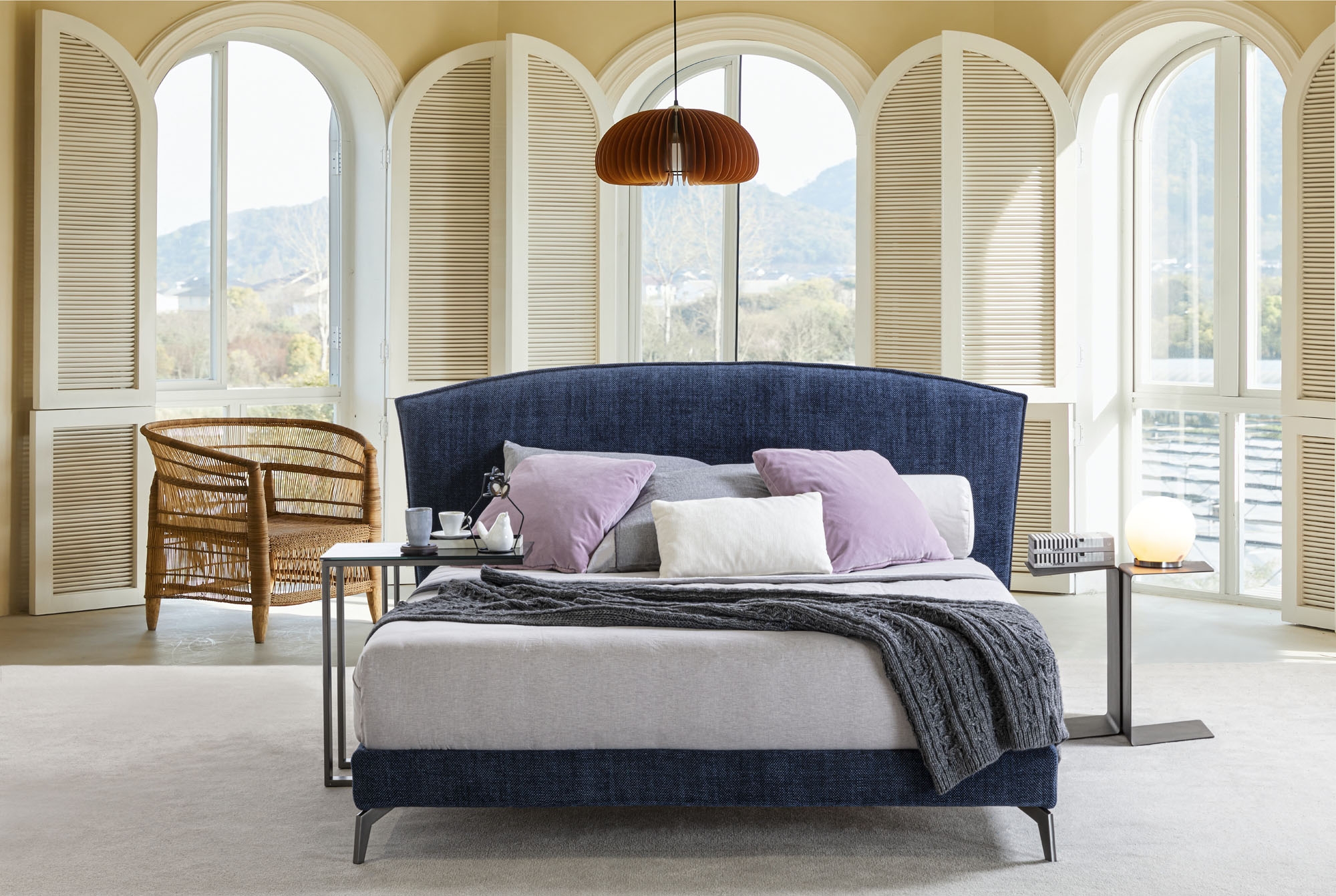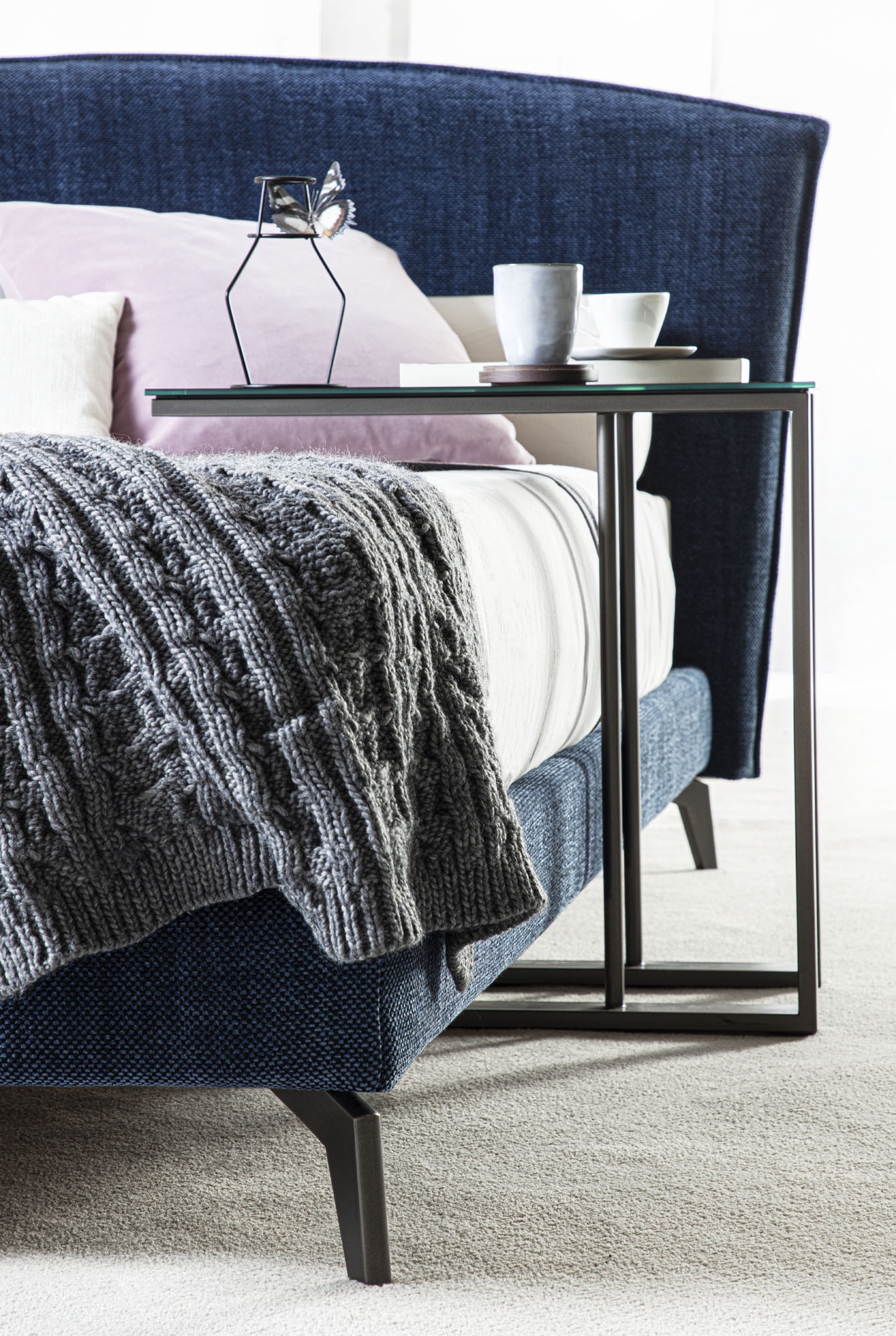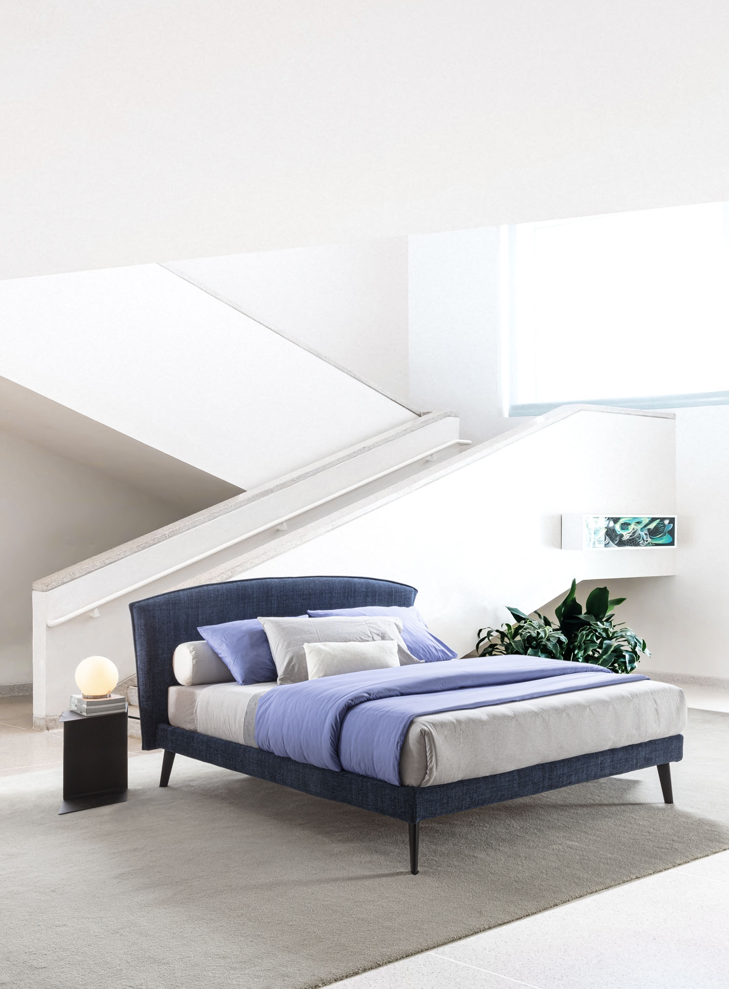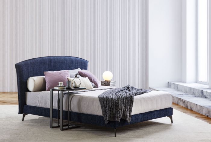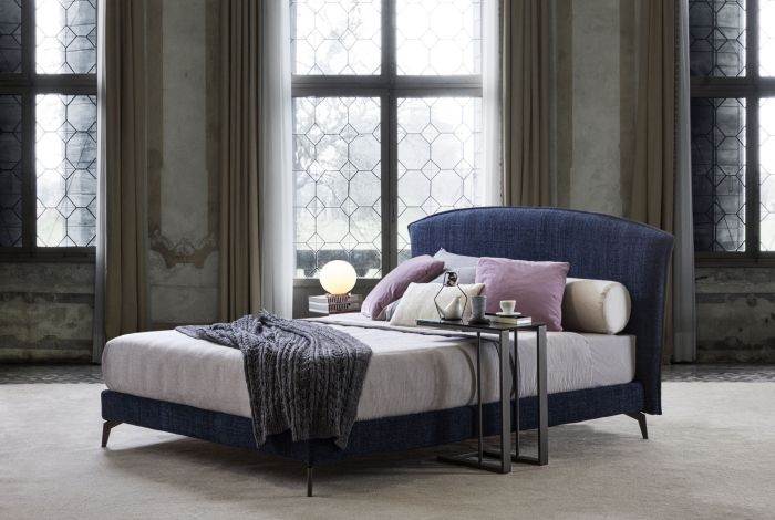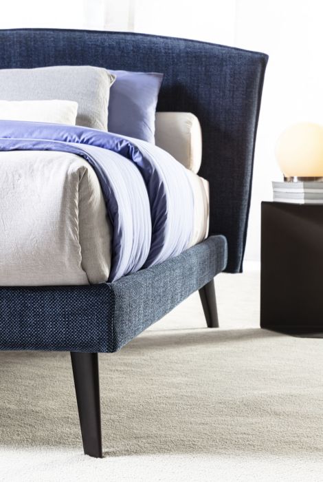 Testata in legno e derivati, imbottita con poliuretano espanso e ricoperta in vellutino accoppiato con fibra acrilica.