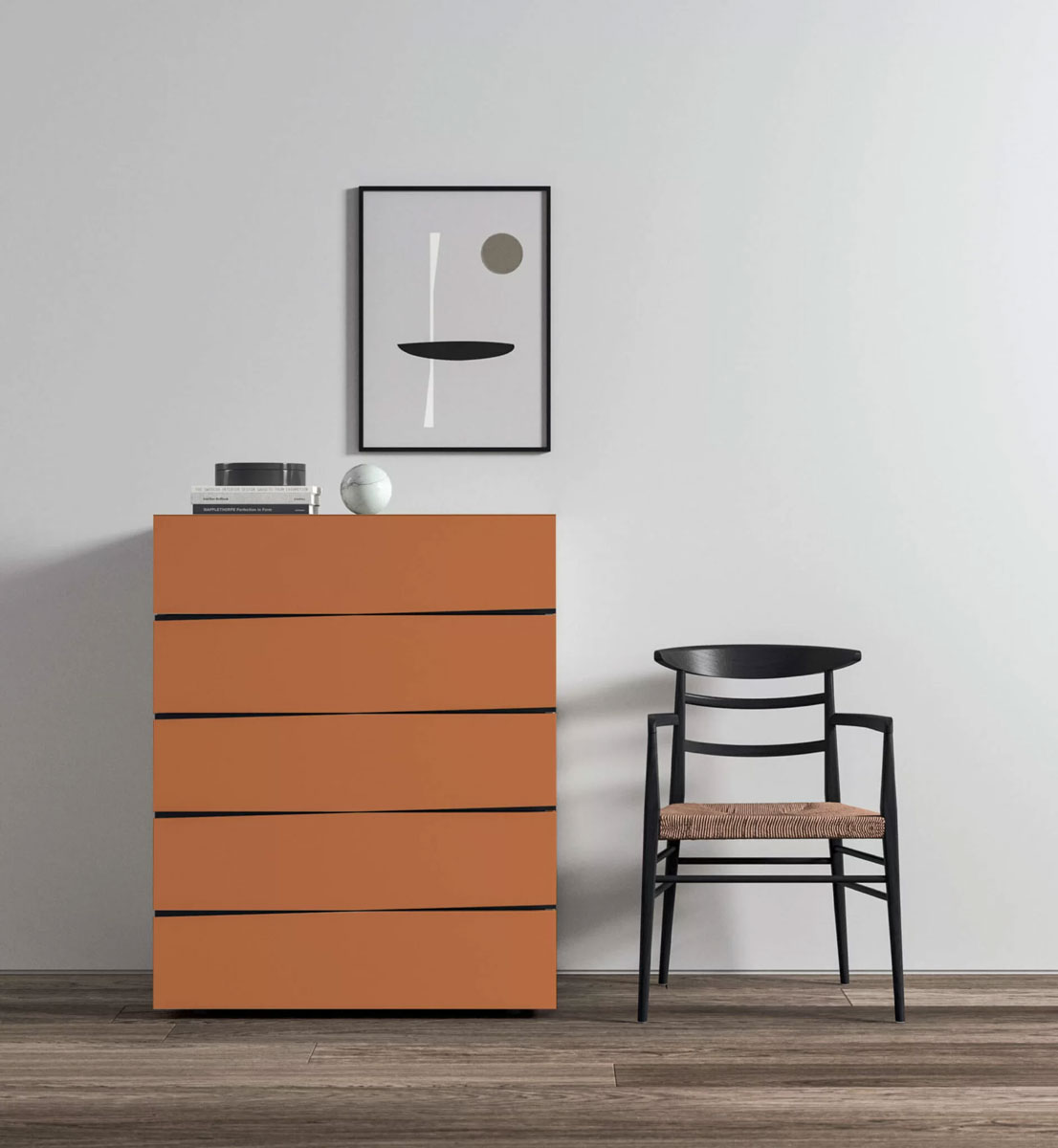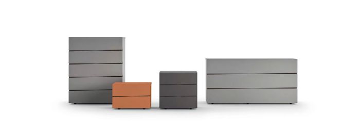 Gruppo notte con struttura e frontali in particelle di legno disponibili in laccato opaco. I frontali realizzati in MDF si caratterizzano per un taglio obliquo studiato per creare un interessante movimento visivo. Dietro questa particolare forma dei frontali si nasconde una pratica e moderna maniglia a gola.