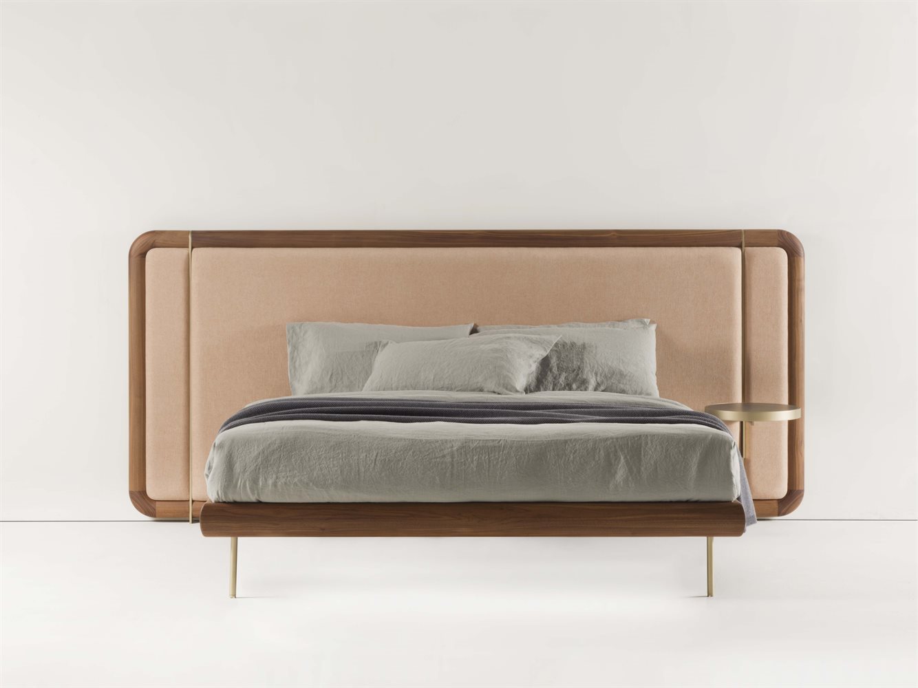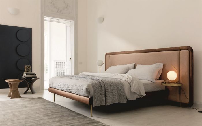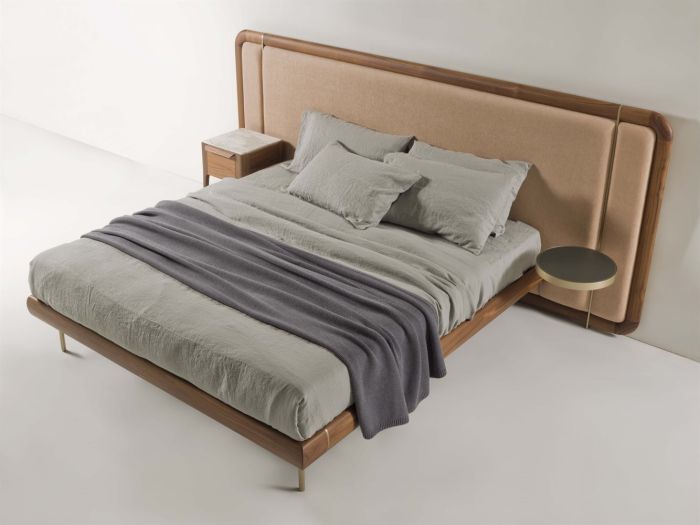 Letto con struttura in noce canaletto, completo di rete a doghe in legno o base in multistrato di betulla, e piedini in ottone spazzolato.