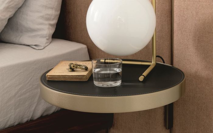 Comodini sospesi opzionali con piano rivestito in cuoio o in Rock nei colori della collezione.