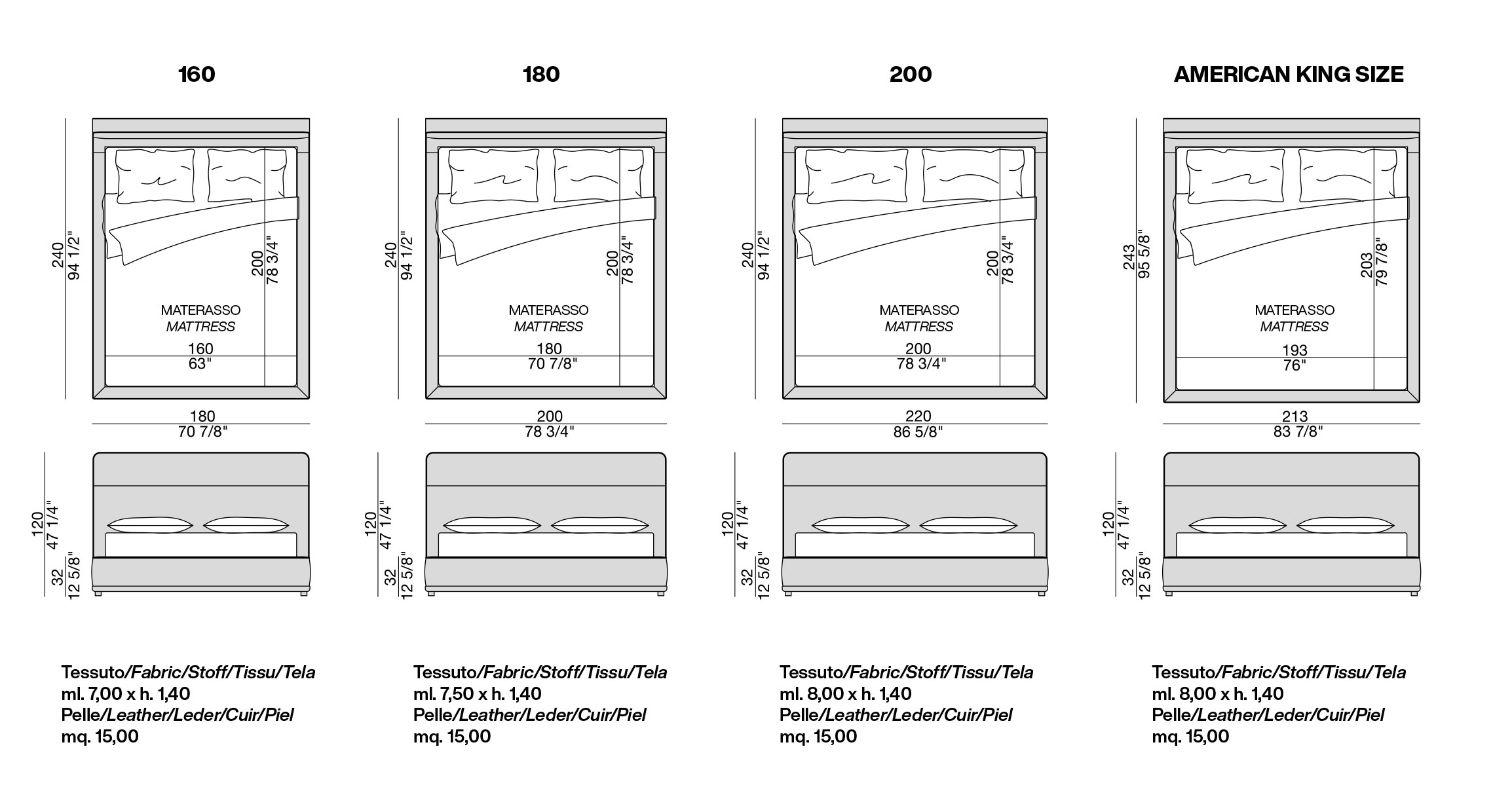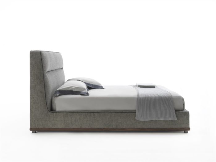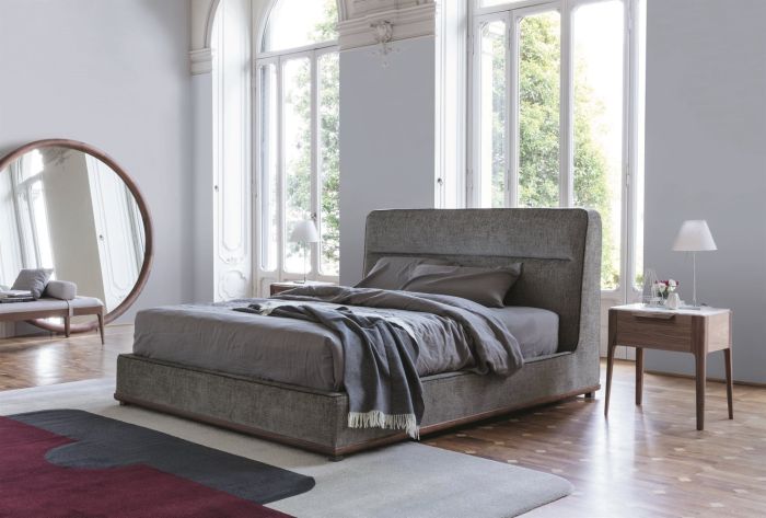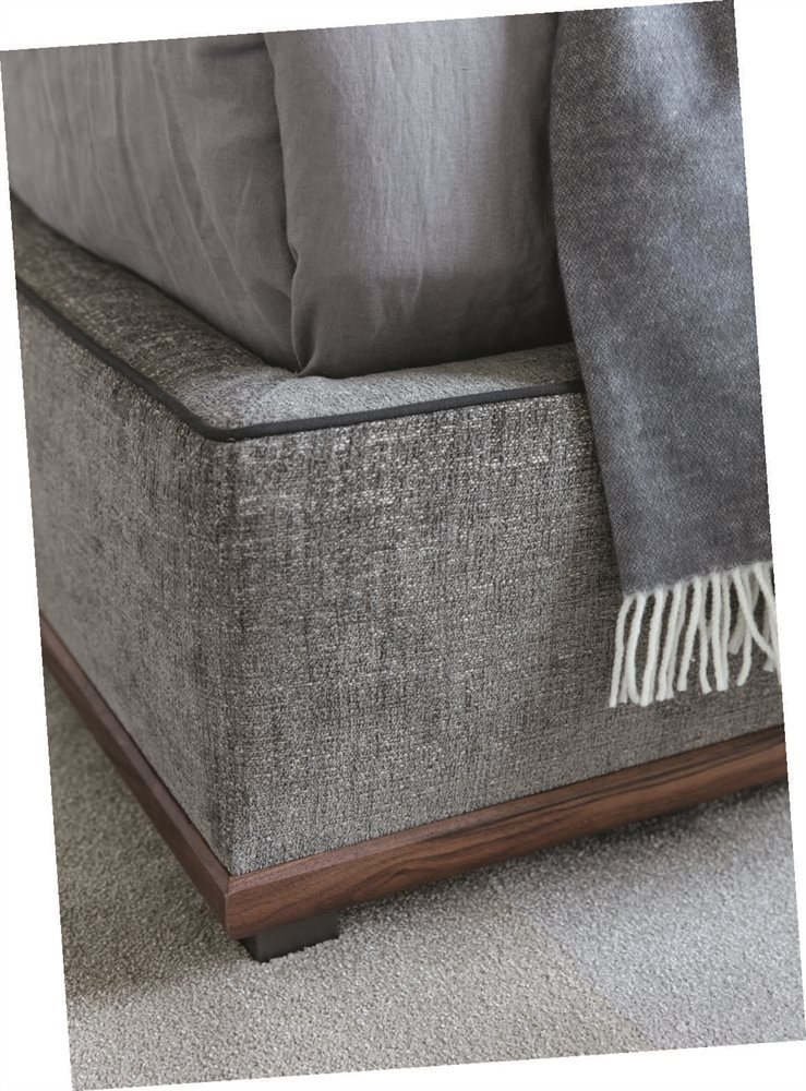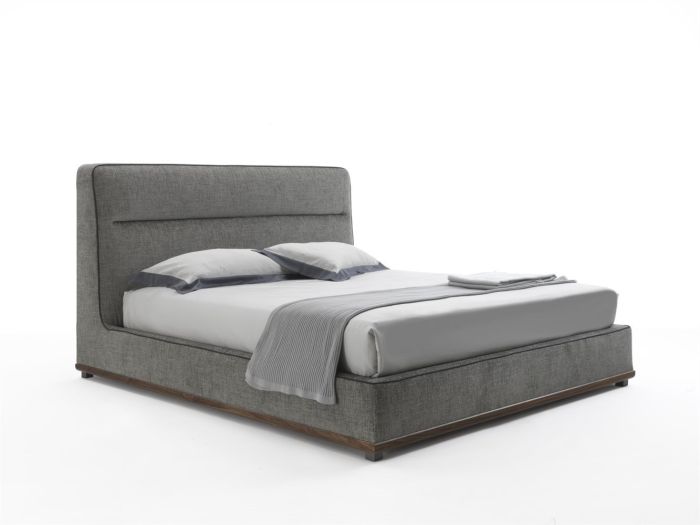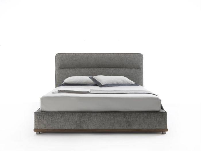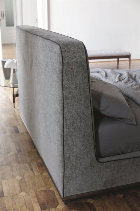 Letto completo di rete a doghe in faggio con base in massello di noce canaletta, sostenuta da piedini in metallo grigio peltro, e rivestimento nei tessuti della collezione. Struttura in legno massello e multistrato, gommato con poliuretano espanso indeformabile. Rivestimento sfoderabile solo in tessuto, smontando la base in legno. Indicare il colore del cordonetto tra le varianti disponibili della collezione ZENITH o verificare la possibilità di averlo nello stesso tessuto del letto.