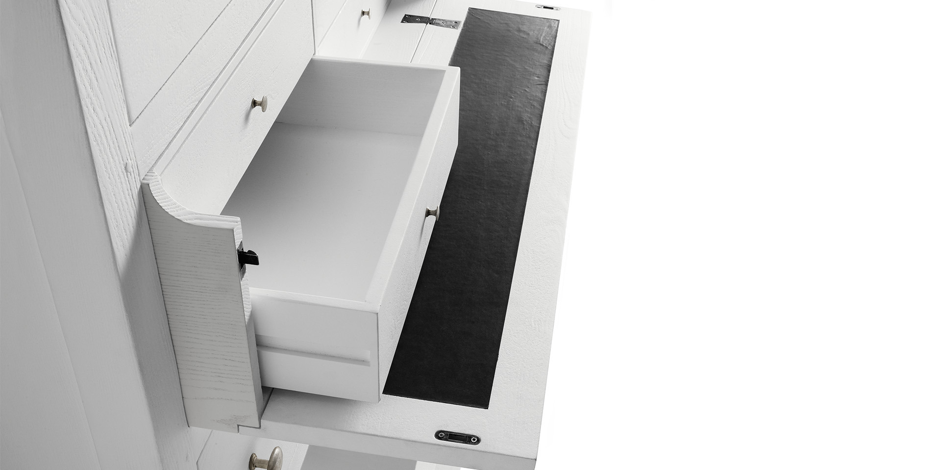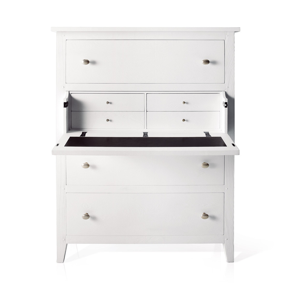Bureau con 3 cassetti, 1 cassetto con ribalta rivestita in pelle toscana e 4 cassettini interni. Lenga massello sabbiato e spazzolato a mano. Disponibile in diverse finiture.
