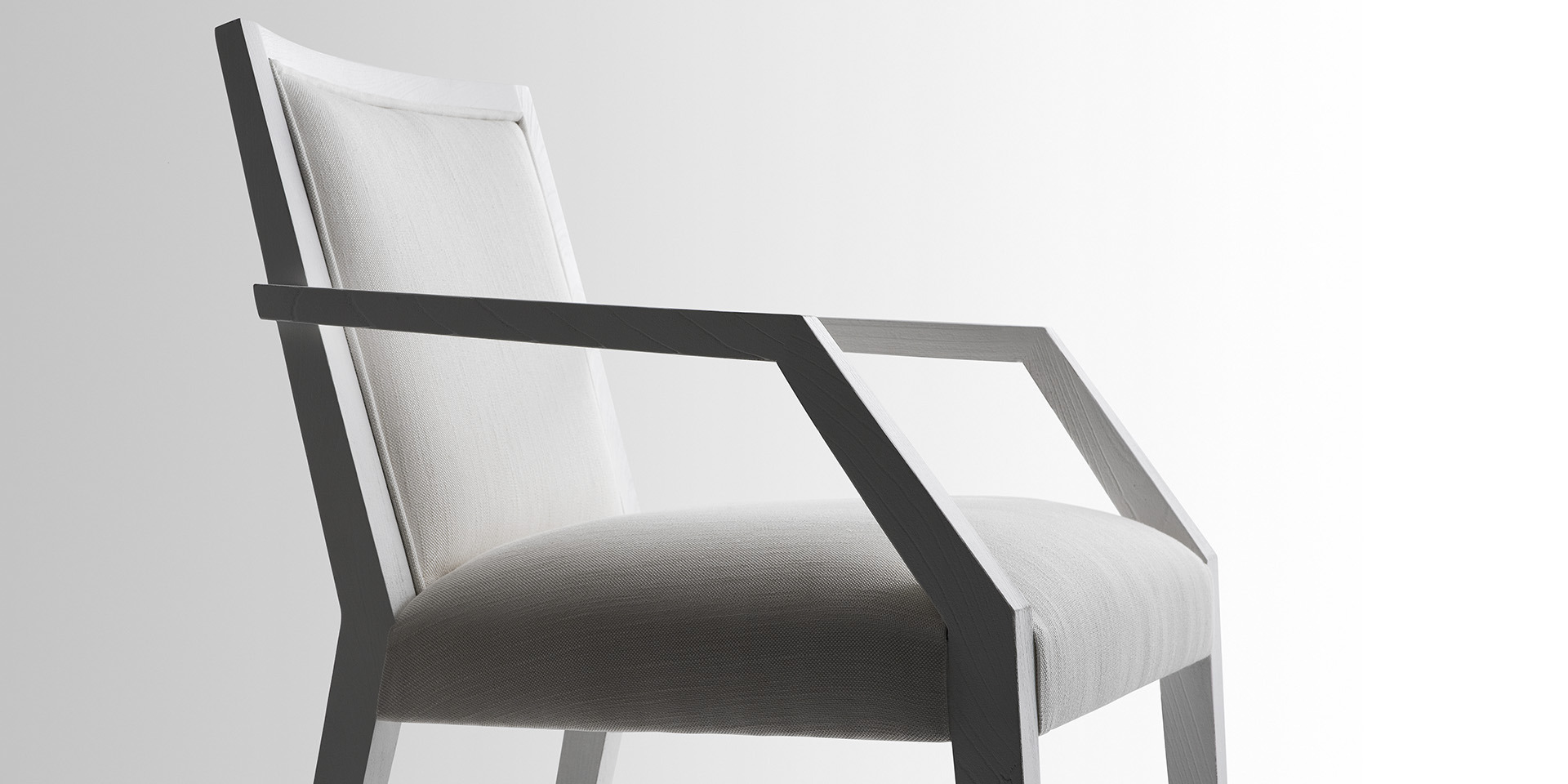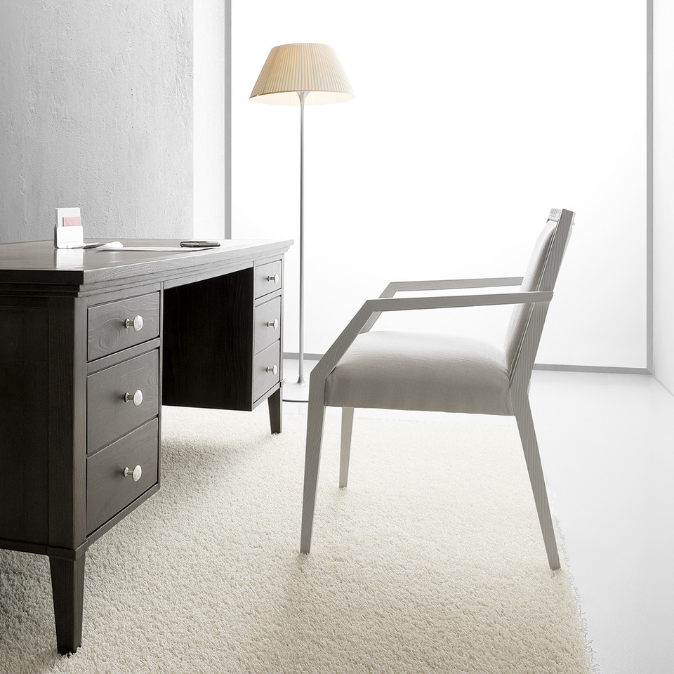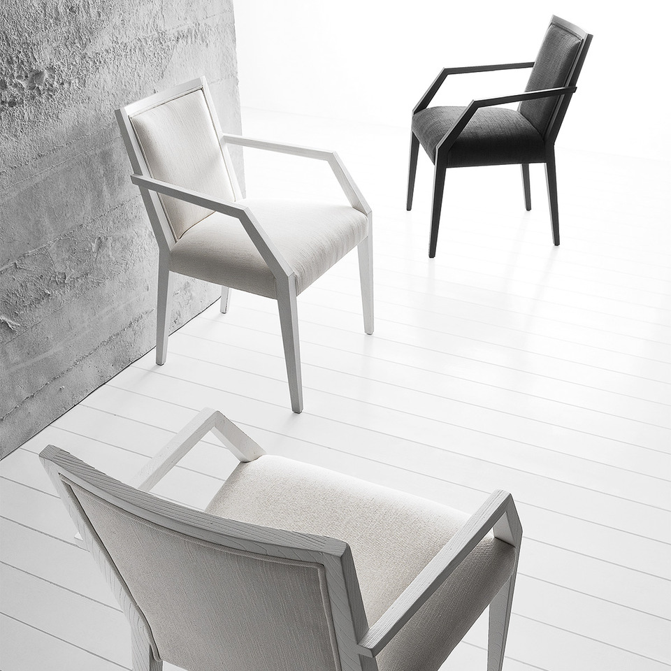 Poltroncina con seduta e schienale imbottiti, struttura in lenga massello. Disponibile in diverse finiture.