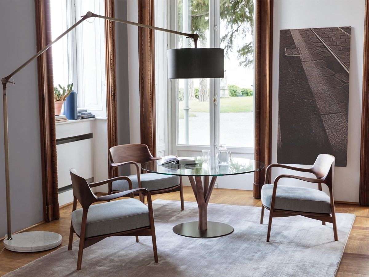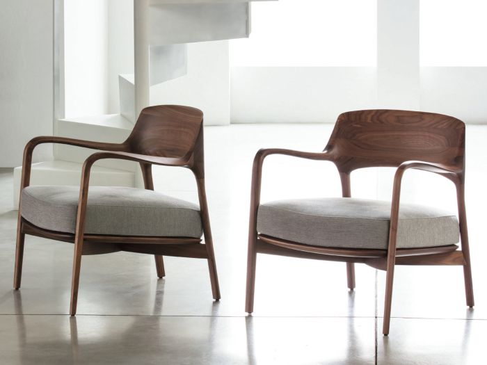 Poltrona con struttura in massello di noce canaletta. Sedile in massello di noce canaletta con imbottitura in gomma a densità differenziata con supporto interno in multistrato e rivestimento nei tessuti della collezione. Terminale piedino in nylon.