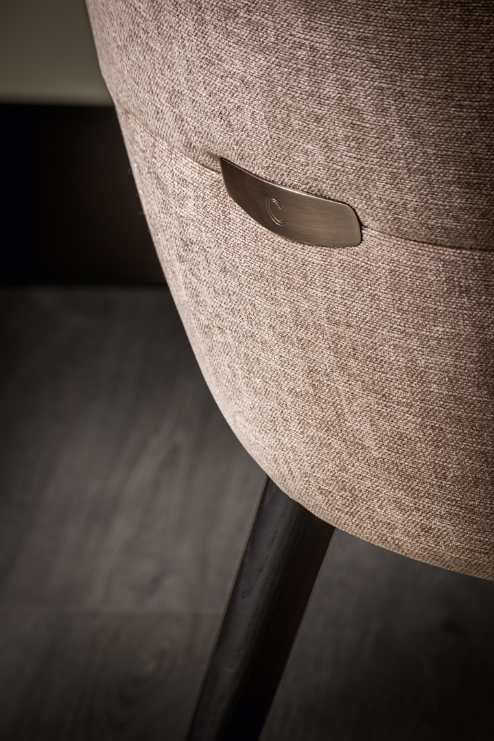 La struttura interna è in legno rivestito in poliuretano espanso a quote differenziate ad alta densità e lo strato superiore ad alta componente elastica. Il rivestimento esterno è personalizzabile in tessuto, pelle o ecopelle. La cura delle impunture dello schienale e il dettaglio in metallo esaltano il design originale.