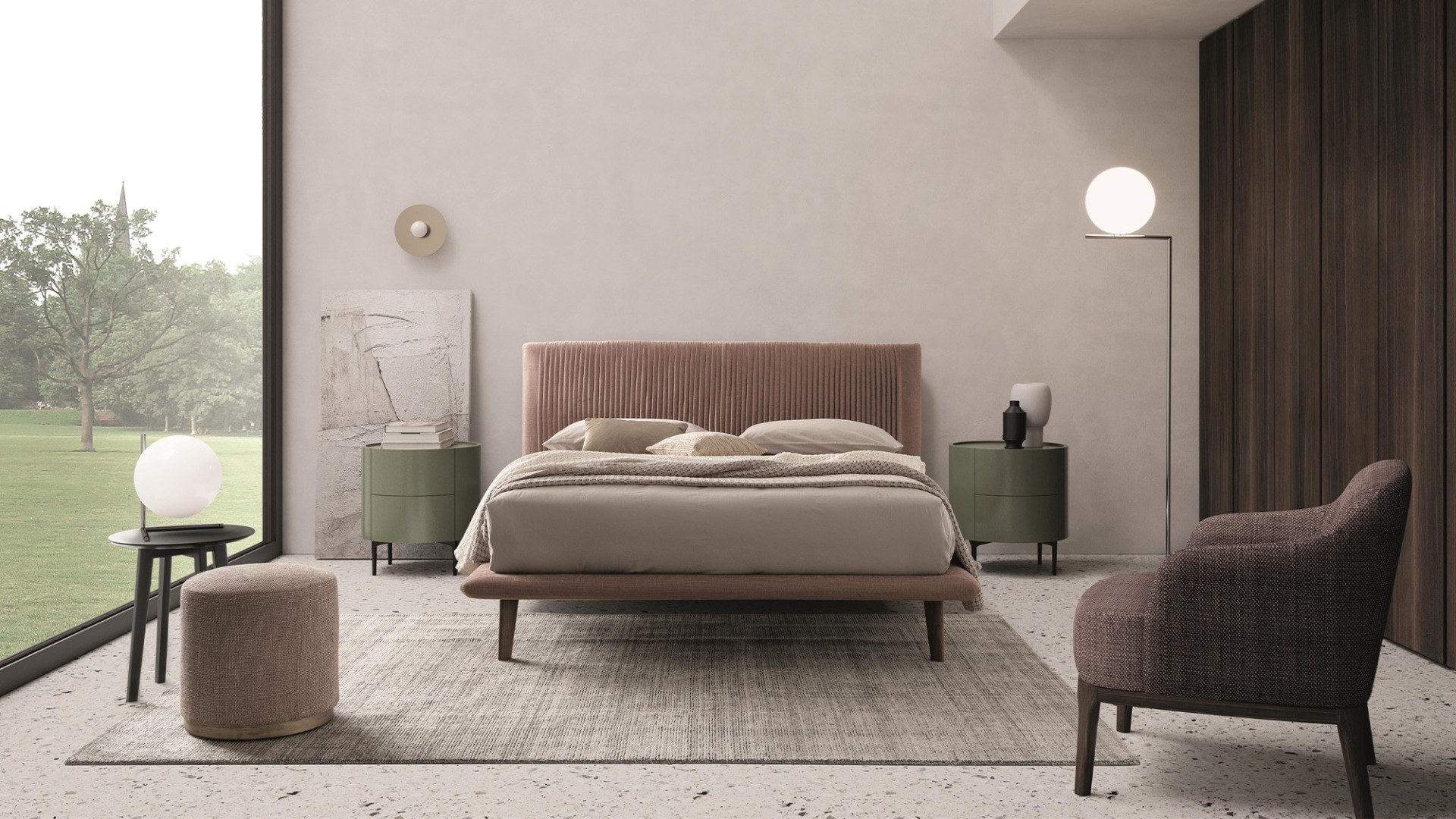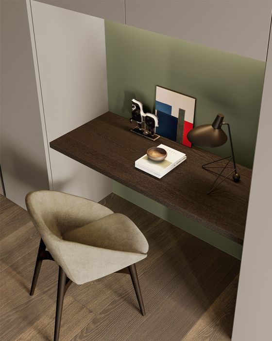Nodo offre anche la possibilità di essere attrezzato con uno scrittoio, trasformando la camera da letto in un ambiente di lavoro o studio senza compromessi. L'aggiunta di uno scrittoio è una soluzione brillante per chi desidera massimizzare funzionalità con estetica. In questa immagine scrittoio in essenza rovere termotrattato con schiena in laccato opaco verde malva e fianchi in laccato opaco canapa.