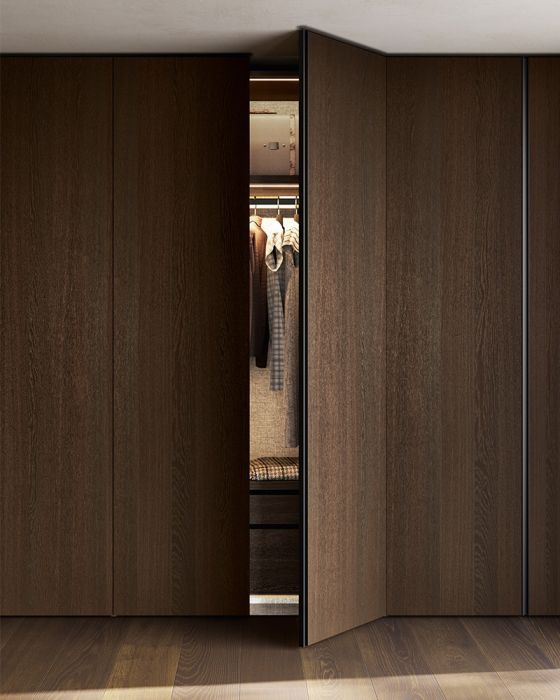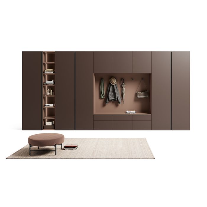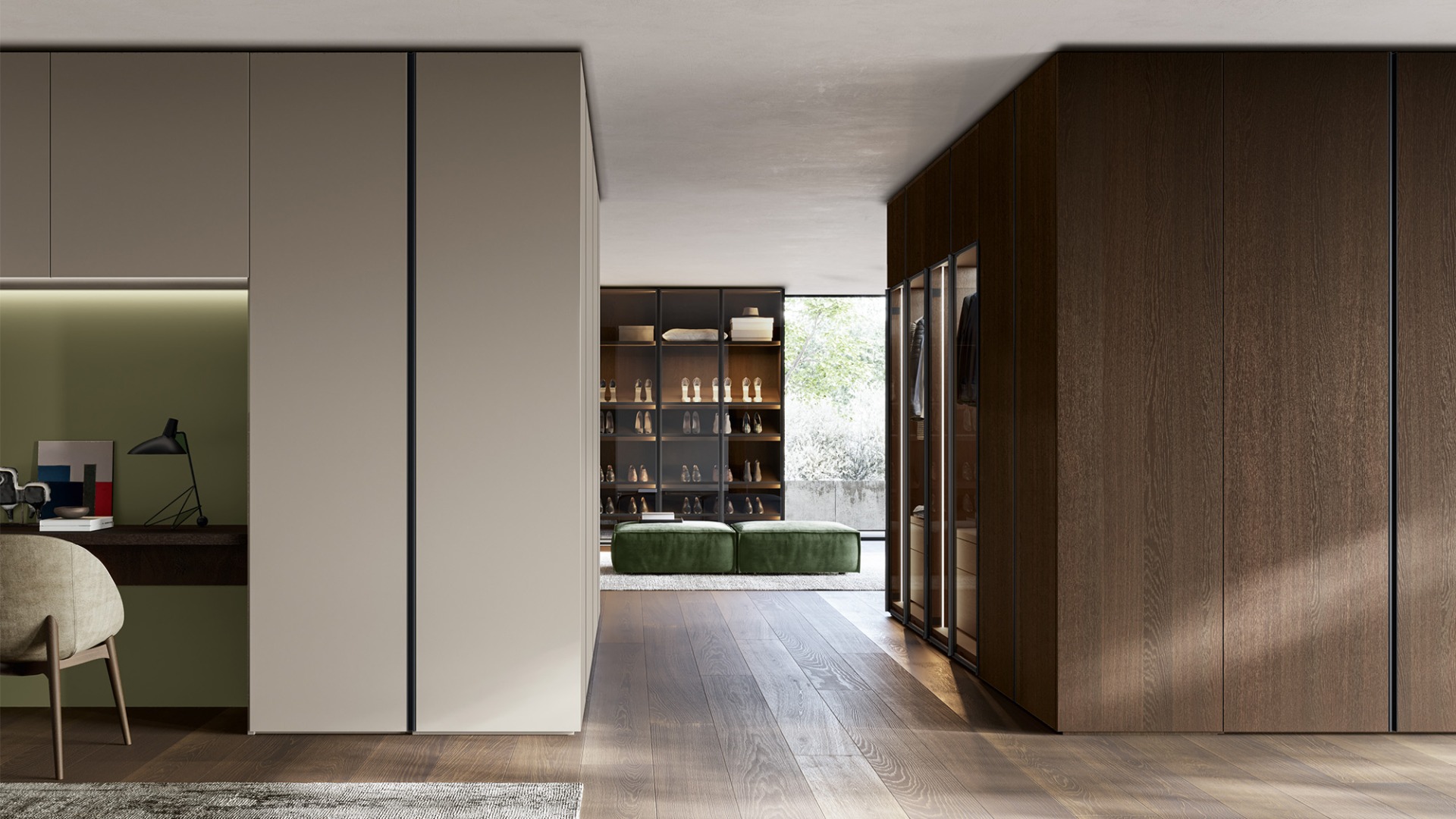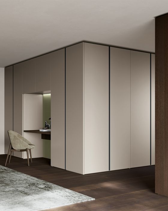 Le maniglie a tutta altezza incassate sono un elemento distintivo del design di Nodo. Le maniglie, non solo aggiungono un tocco di classe all'armadio, ma forniscono anche una presa comoda e intuitiva quando per aprire o chiudere le ante. Disponibili in una varietà di colori laccati o finiture metalliche, le maniglie delineano le gole dell'anta, creando un contrasto visivo affascinante.