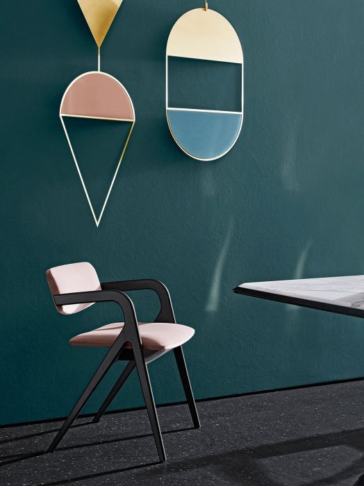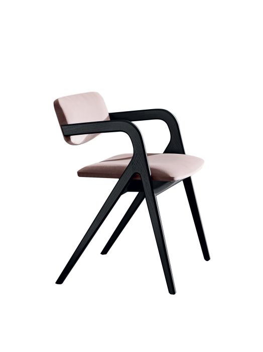 Sedia con struttura in massello di frassino tinto nero poro aperto. Disponibile anche in frassino naturale, tinto tabacco o tinto bianco poro aperto. Seduta con struttura interna in legno e derivati imbottita in poliuretano espanso indeformabile. Schienale in poliuretano strutturale annegato in schiuma poliuretanica flessibile.