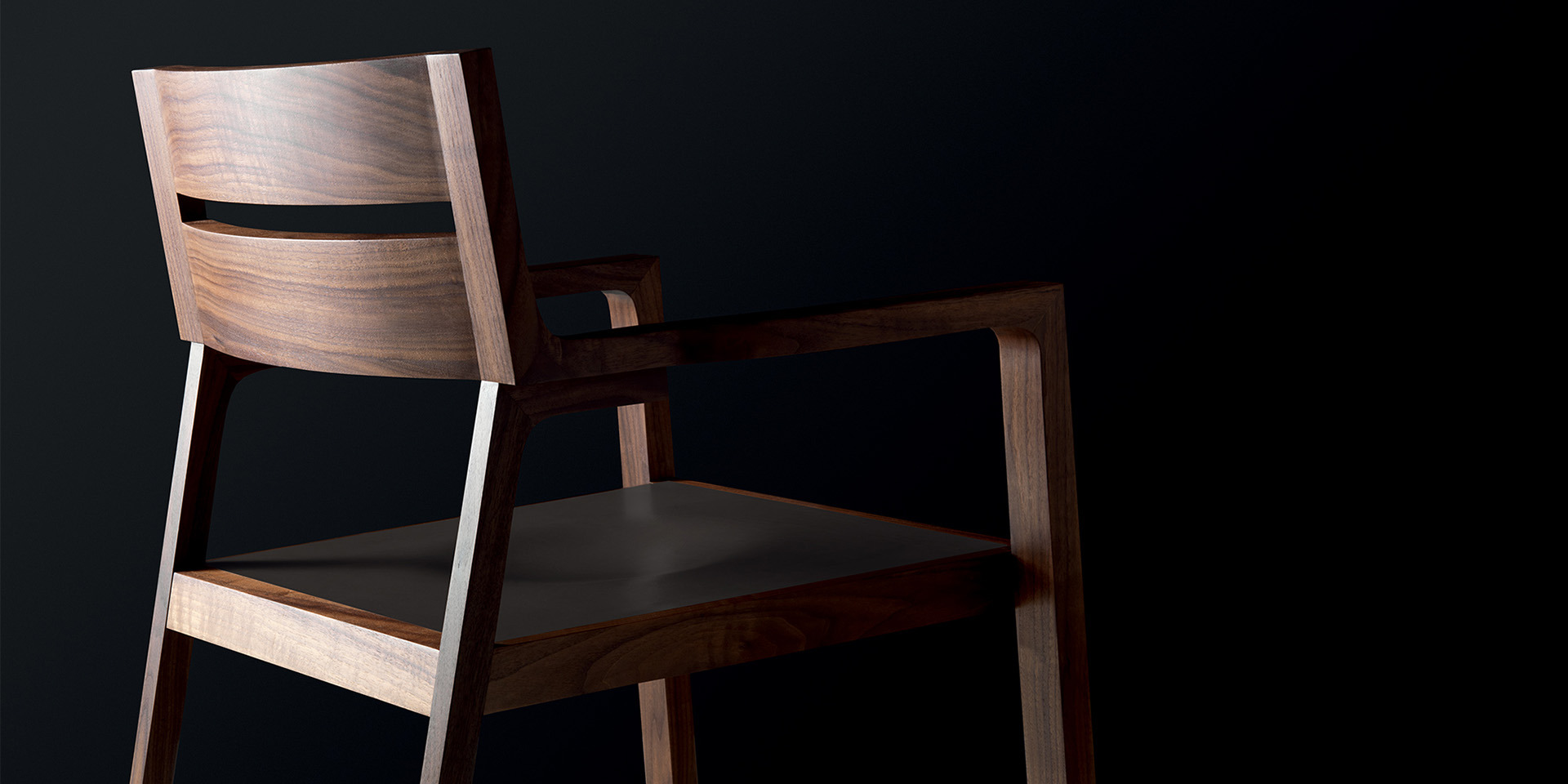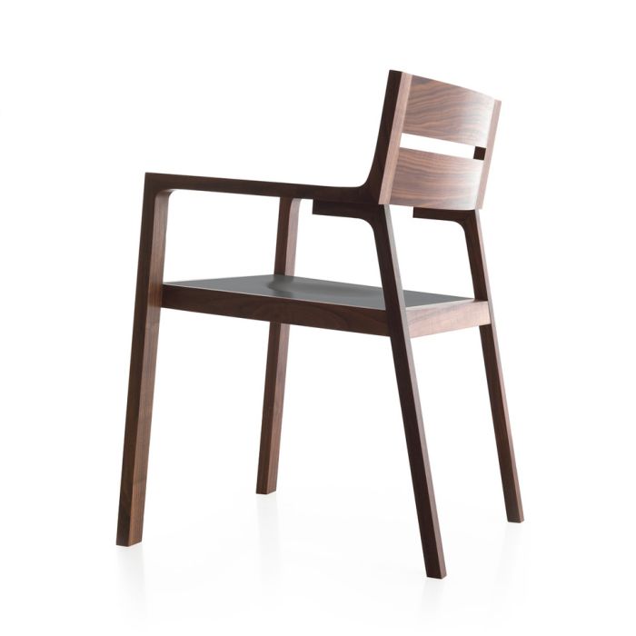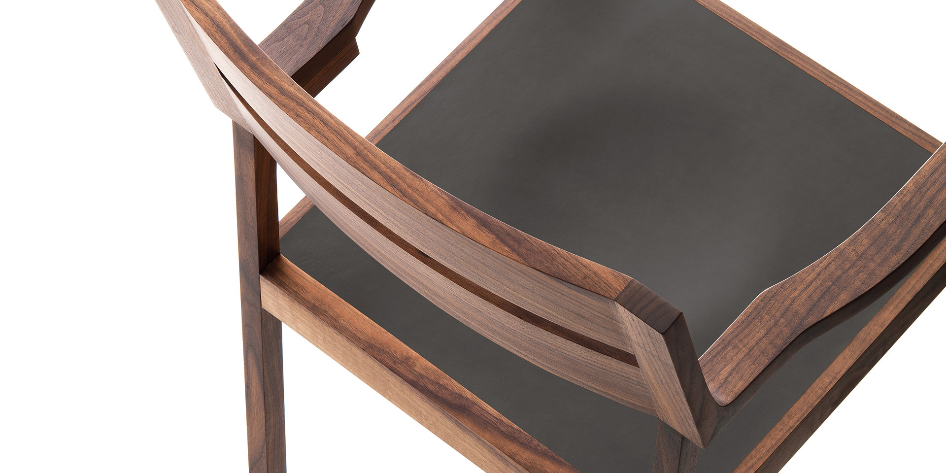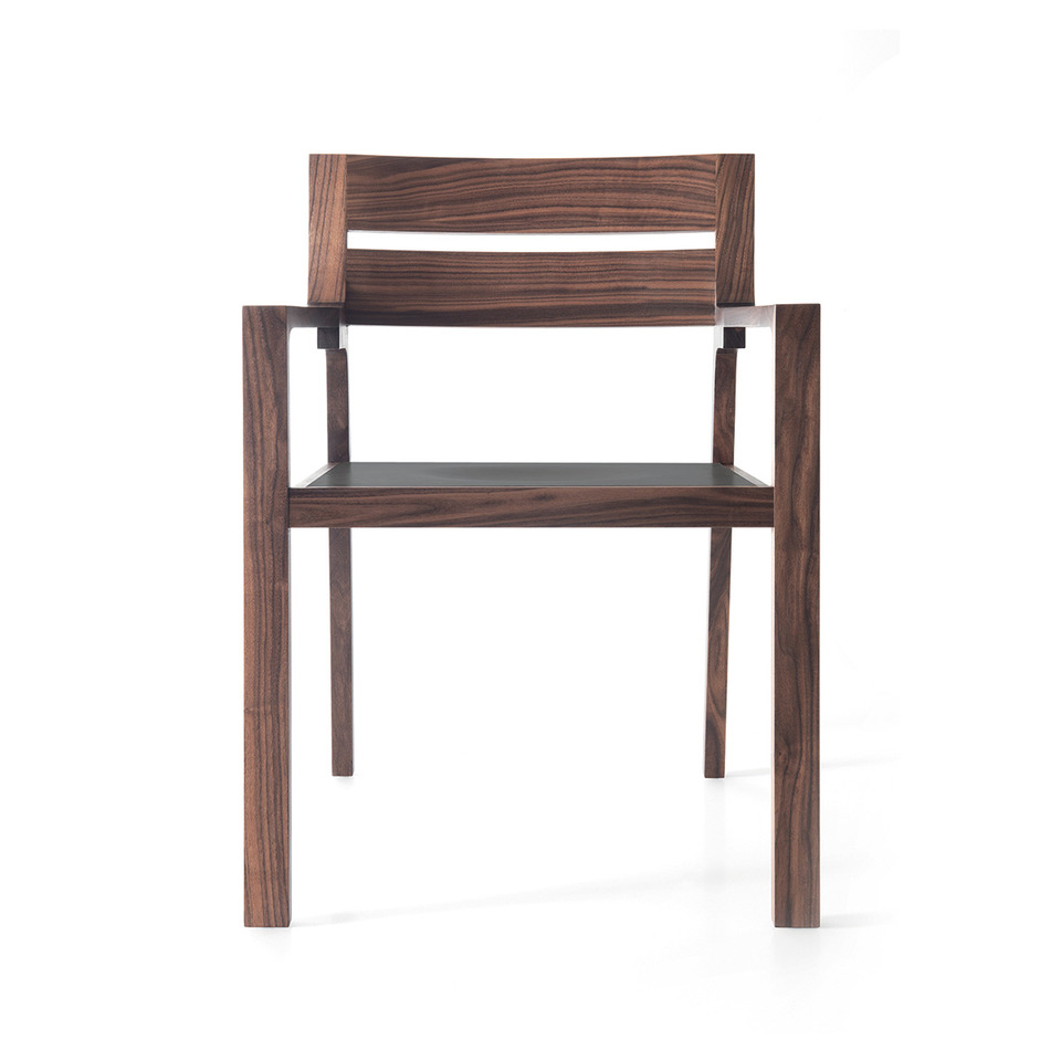 Sedia con braccioli, noce massello oliato. Seduta in cuoio toscano nero.