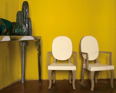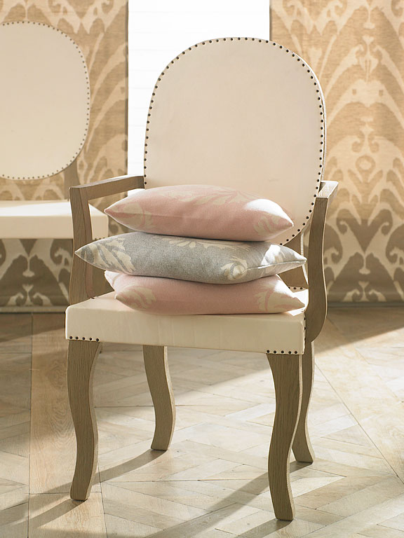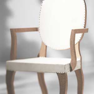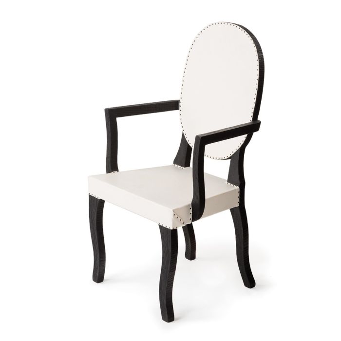 Sedia in rovere massello sabbiato con braccioli, seduta e schienale in pelle pergamena. Disponibile in diverse finiture.