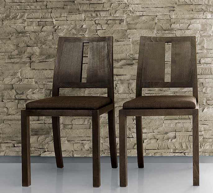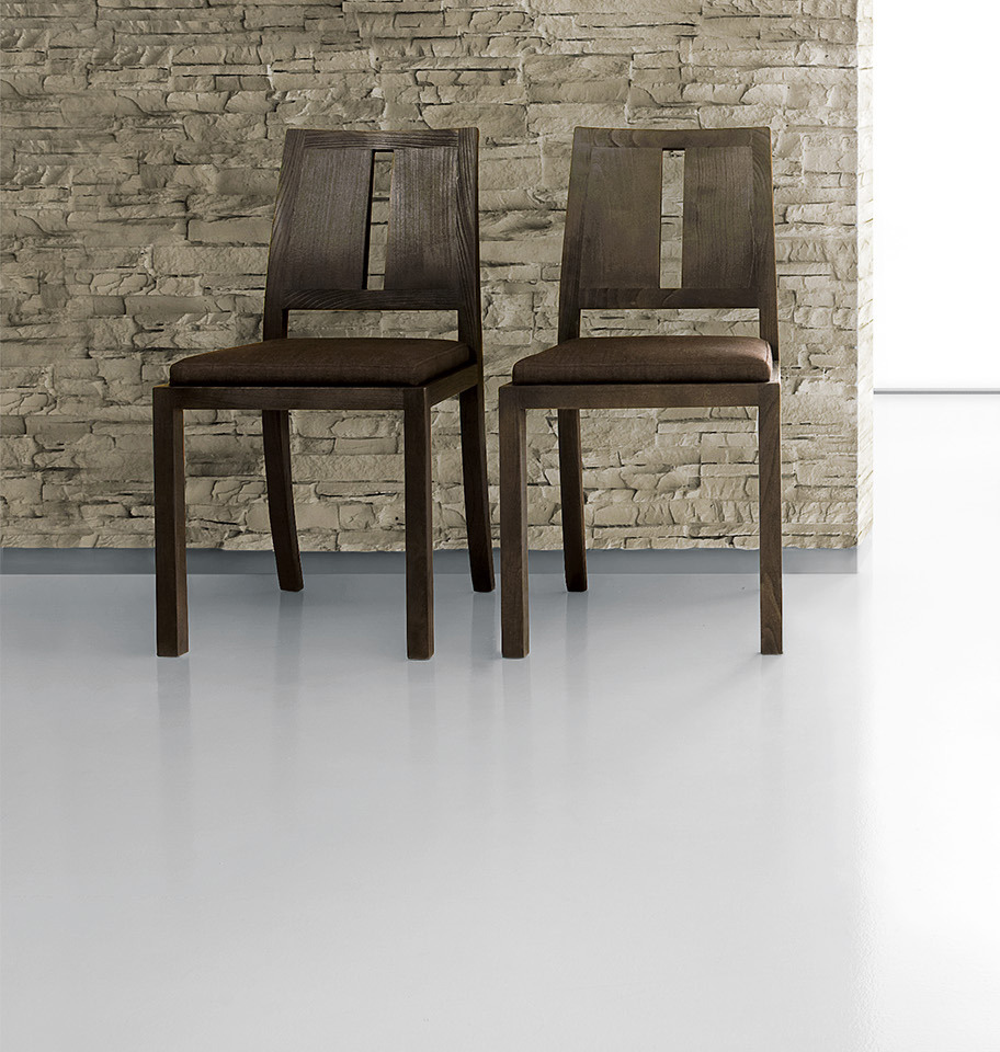 Sedia in legno massello, seduta imbottita e tappezzata. Disponibile in diverse finiture