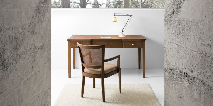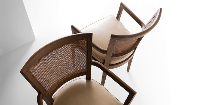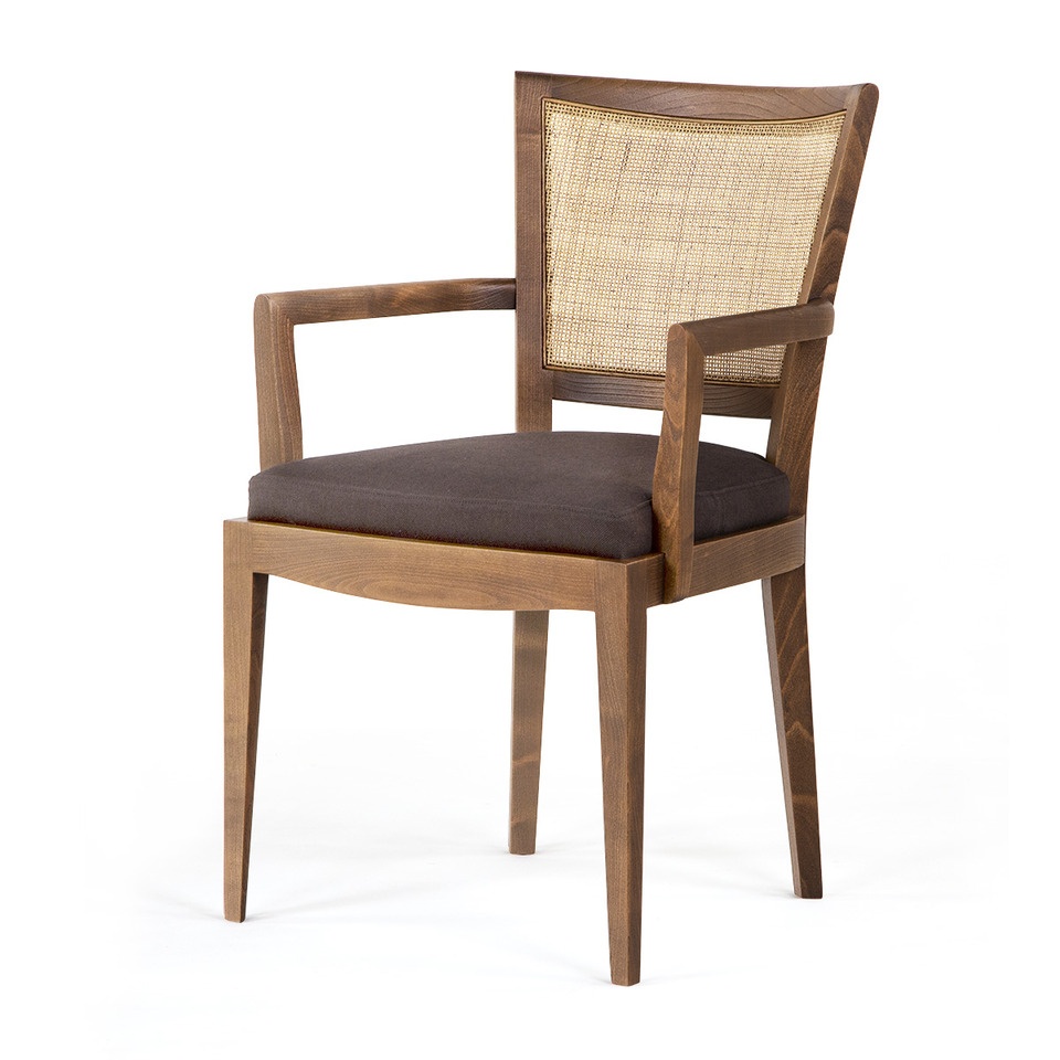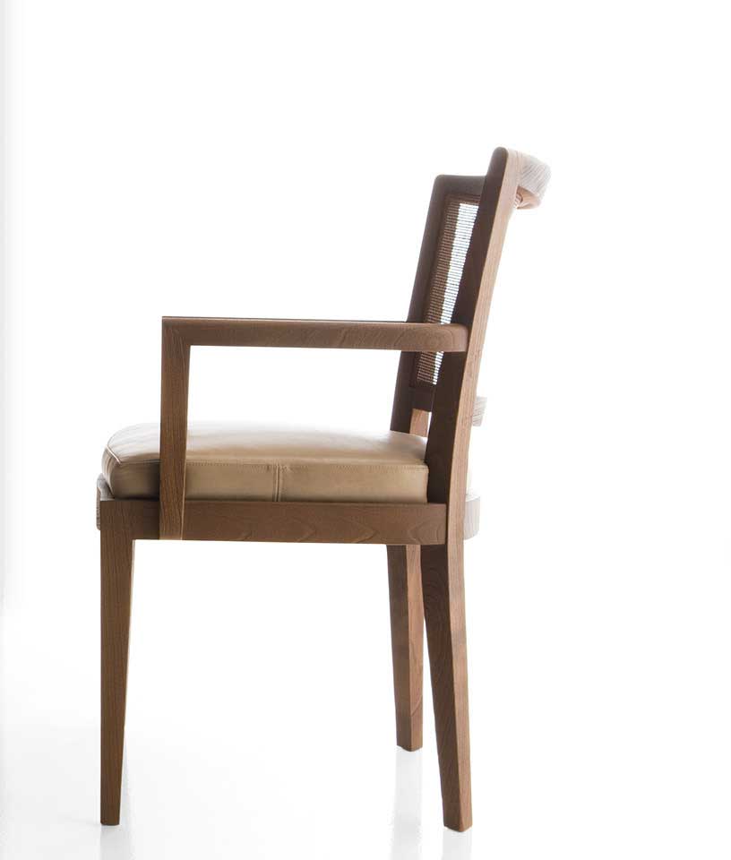 Sedia con braccioli, seduta imbottita e schienale in paglia di Vienna, struttura in legno massello. Disponibile in diverse finiture.