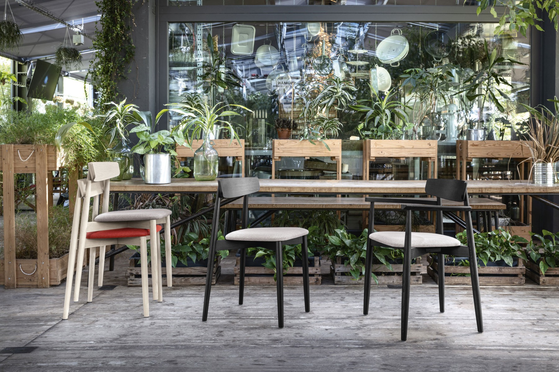 Sedia dall’espressione dolce, che evoca i bistrot parigini post-impressionisti. Impilabile per quattro, è disponibile anche con braccioli.