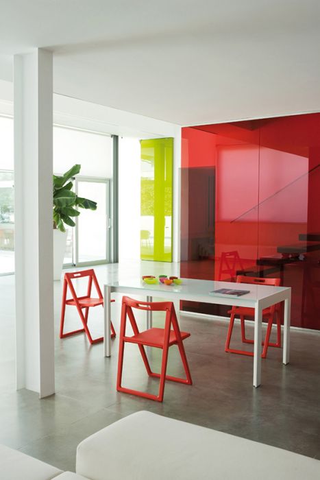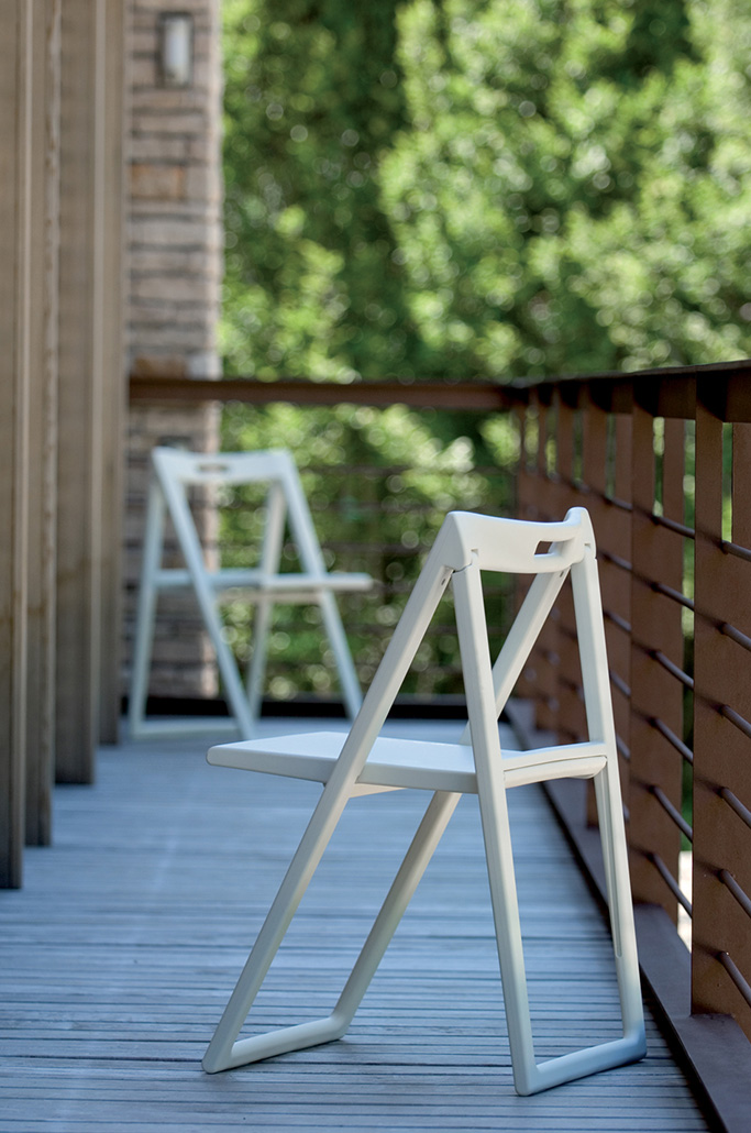 Coppia di sedie compatte e leggere, Enjoy è una sedia pieghevole in polipropilene utilizzabile anche negli ambienti outdoor. Facilmente movimentabile, una volta riposta occupa uno spazio di soli 95 mm.