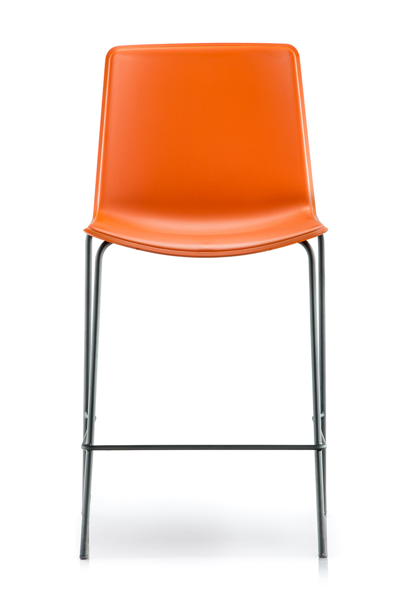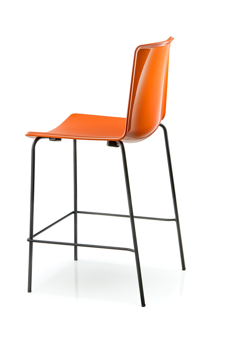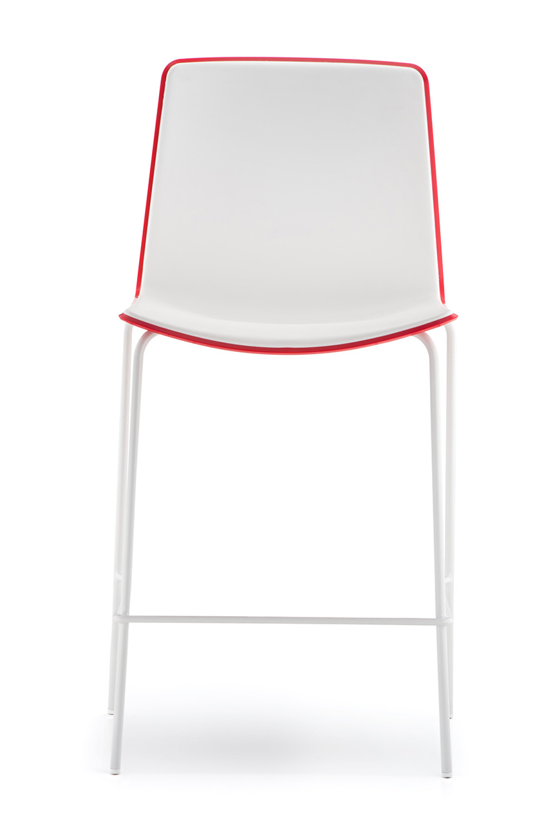 Coppia di sgabelli con scocca in polipropilene stampata a bi-iniezione con finitura opaca antigraffio per la parte frontale, finitura lucida per il retro. E' possibile scegliere il colore scocca tra monocolore o bicolore. Versione monocromatica con struttura in acciaio Ø14 mm cromato.