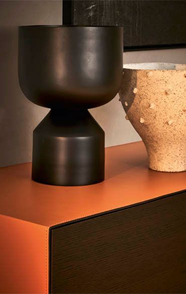 Il basamento ha una forma tronco-piramidale rovesciata, che si traduce esteticamente in un sostegno dall’aspetto molto stabile, svasato, ma anche in un elemento che non rinuncia a dialogare con la struttura, vestendosi di oro, bronzo, titanio, o di un colore laccato, a scelta tra tutti quelli della collezione Pianca.