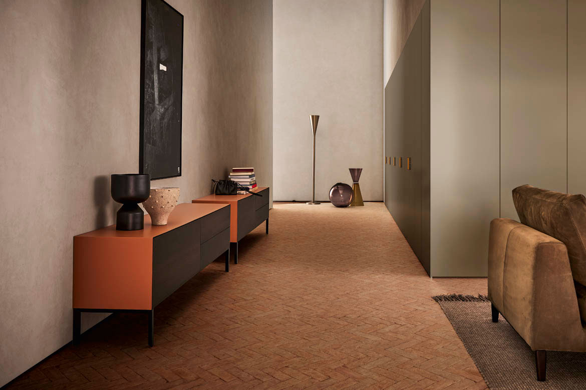 Coordinata o in contrasto può essere la finitura delle superfici della madia, disponibili anche in 7 essenze lignee, tra cui quelle esotiche del palissandro e dell’ebano, che garantiscono un prodotto davvero unico.