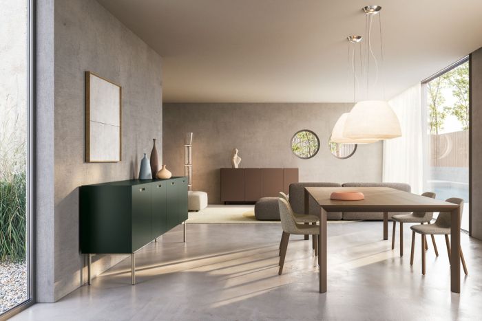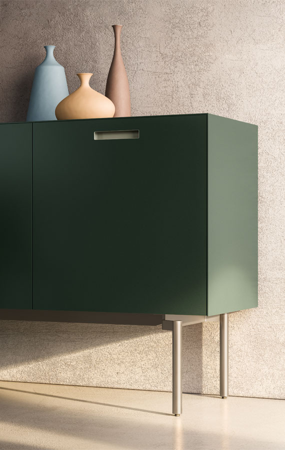 Coordinata o in contrasto può essere la finitura delle superfici della madia, disponibili anche in 7 essenze lignee, tra cui quelle esotiche del palissandro e dell’ebano, che garantiscono un prodotto davvero unico.