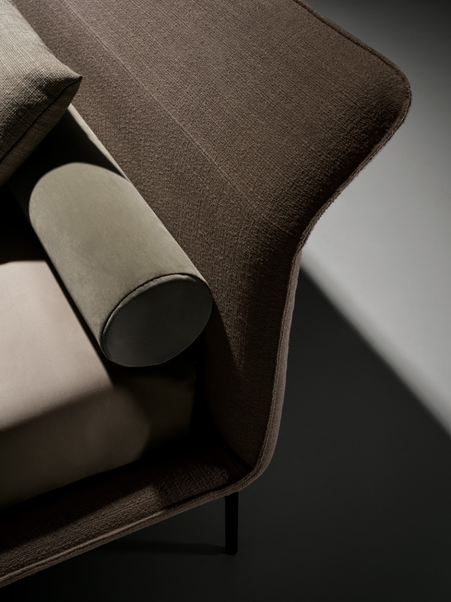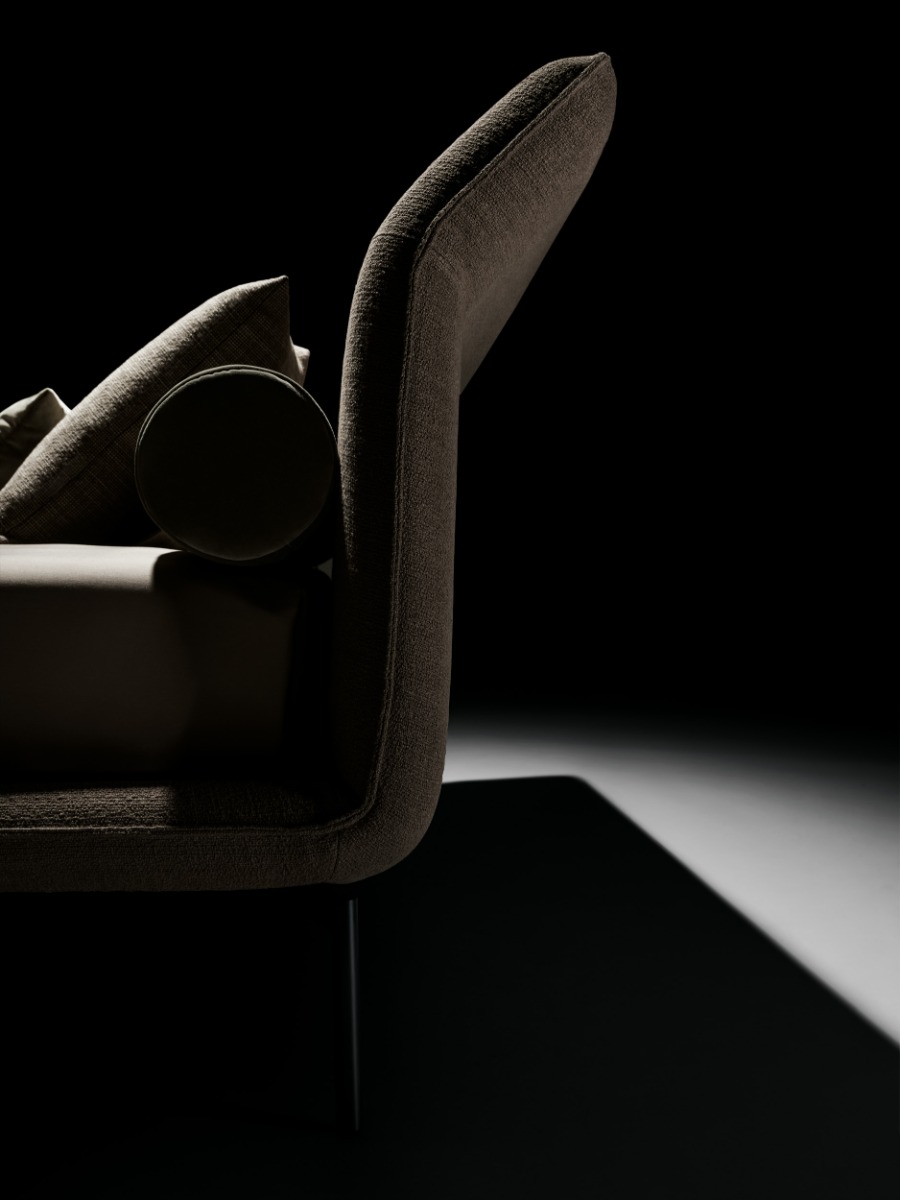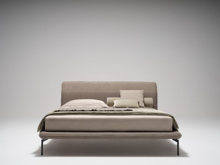 Le cuciture ribattute in evidenza sottolineano la dinamicità e la grazia dei profili. Lo spessore delle imbottiture contribuisce a controllare i volumi senza togliere comodità a un letto dal concept contemporaneo che si integra razionalmente in tutte le zone notte in cui lo spazio diventa un elemento decisivo per la scelta dei pezzi d’arredo.