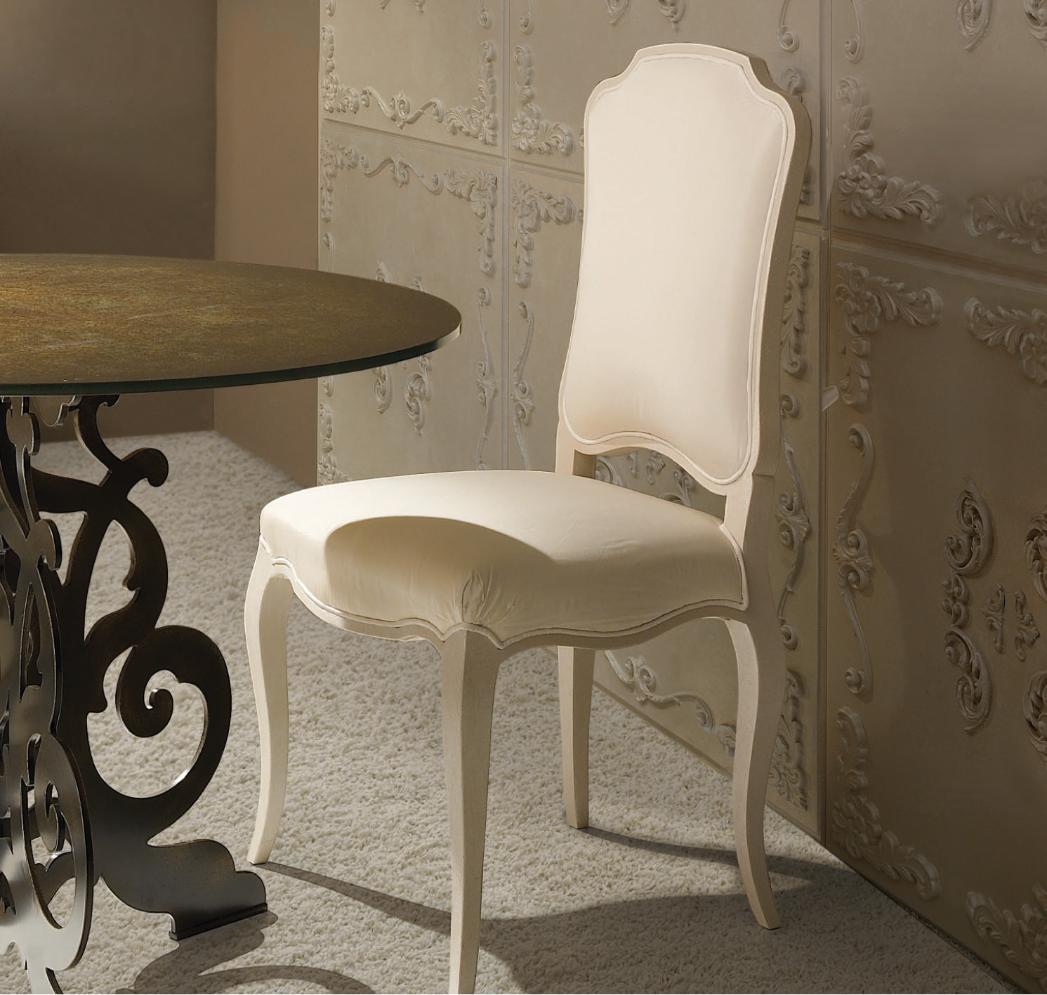Sedia in legno con seduta imbottita, rivestita nei tessuti della collezione.
