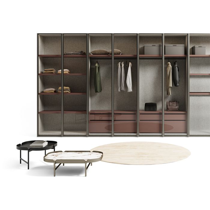 L’armadio con anta battente Glass Up in vetro trasparente è per chi predilige soluzioni visivamente leggere, che lasciano intravedere gli interni. È lì che puoi dar spazio alla massima personalizzazione: come attrezzerai questo tuo universo fra cassettiere, ripiani, raster, scarpiere e altri accessori?