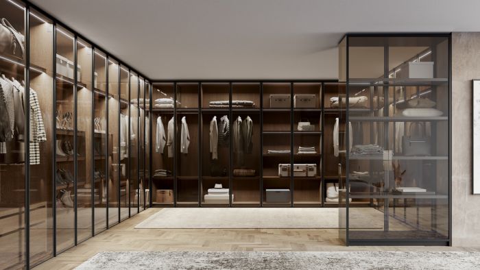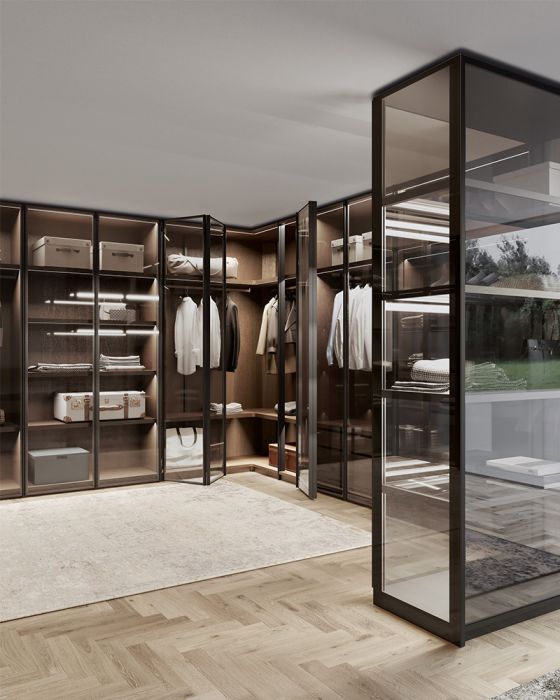 L’anta battente in vetro Glass Up ha la maniglia inserita nel telaio dell'anta. La chiusura è ammortizzata, pratica e sicura. Nelle immagini, proponiamo l’armadio in vetro tessuto grigio con fianchi in laccato opaco light grey e telaio in metallo nero.