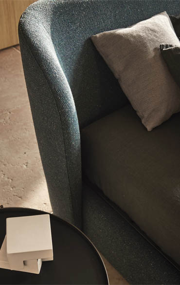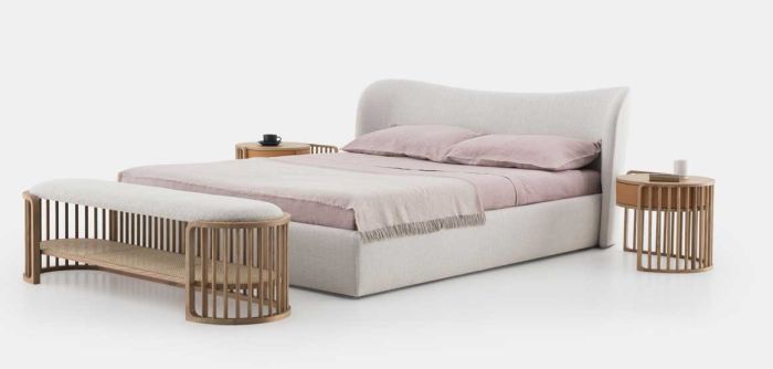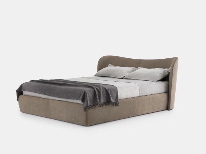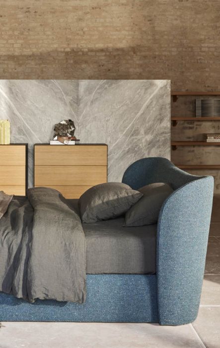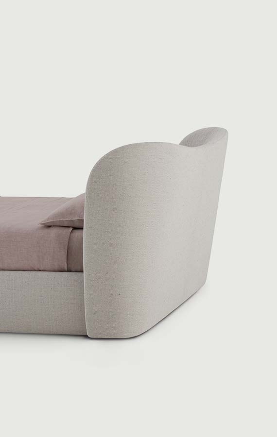 La testiera curvilinea, protagonista dell’intera composizione, racchiude al suo interno il corpo del letto, piegandosi in un abbraccio avvolgente e materico, offrendo spalle protettive e rassicuranti. Nella versione senza box contenitore, il materasso può essere incassato all’interno della struttura.