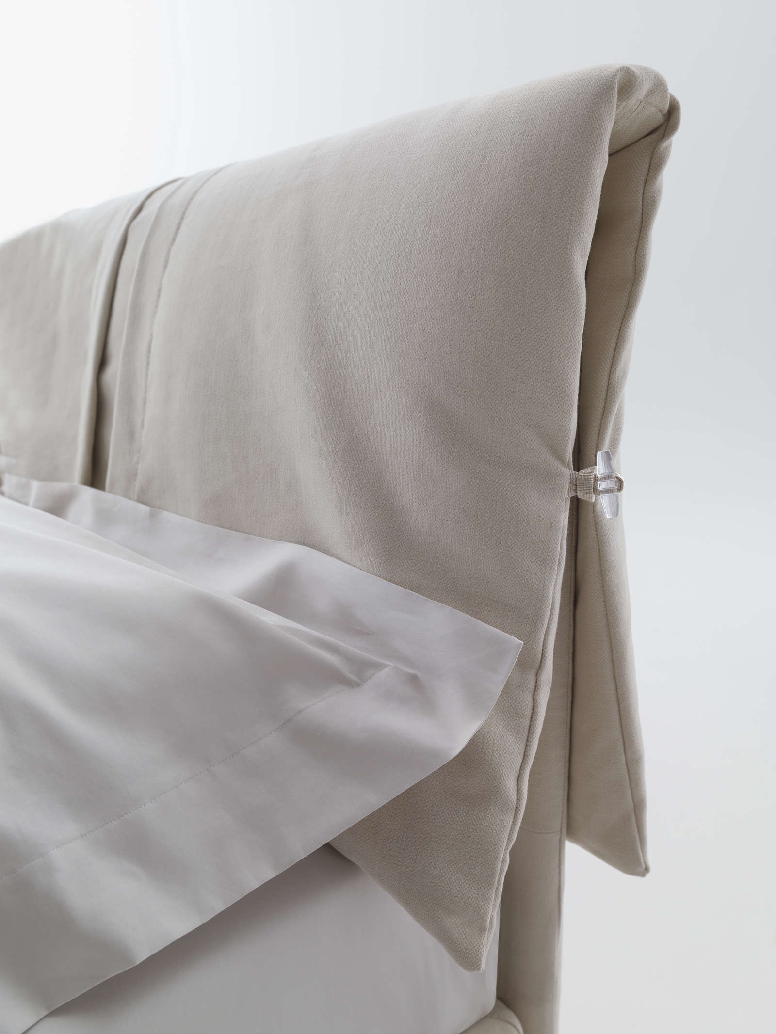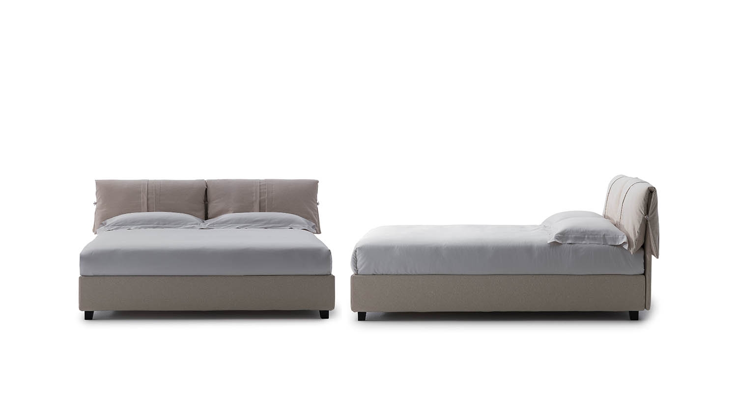 Letto rivestito in tessuto o in pelle con rete a doghe in legno di faggio con parte centrale a sostegno regolabile. Piedini a vista in legno disponibili in tre diverse finiture. Testata alta imbottita.