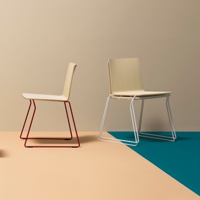 Osaka metal 5714: scocca in multistrato di frassino e struttura a slitta in tondino d'acciaio Ø 11 mm. Impilabile 4 pezzi. L 54 x P 52 x H 77 cm (H seduta 46 cm)