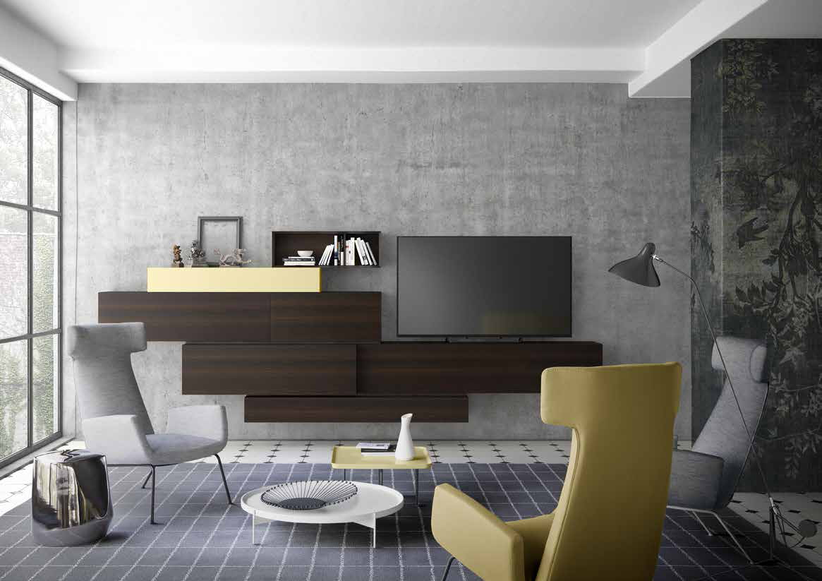Composizione da L 410 x P 45 x H 180 cm con moduli ribalta, modulo cassetto e pensile a giorno. Finitura borgogna e laccato opaco paglia.