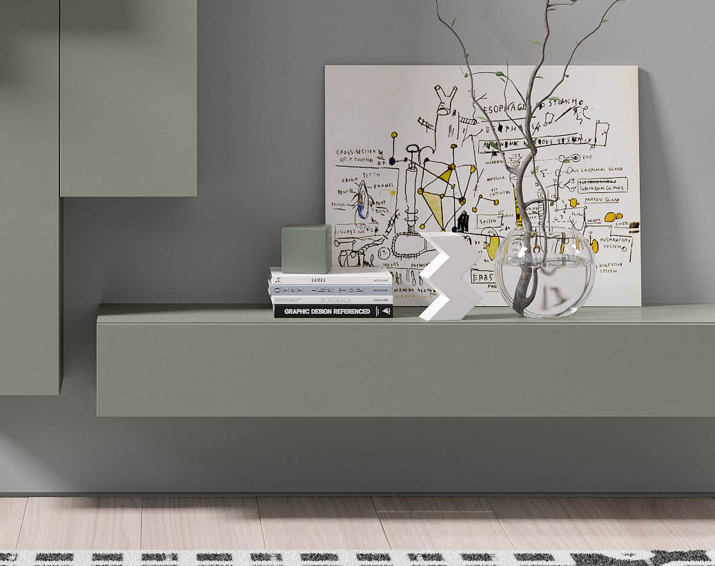 N°1 modulo cassetto pensile (L 150 x P 35 x H 20 cm) in laccato opaco fumo;