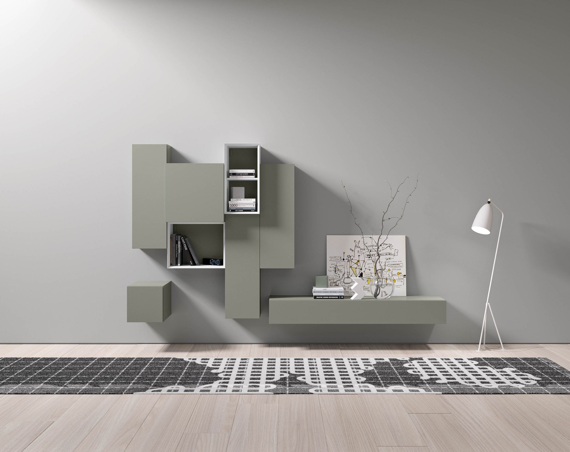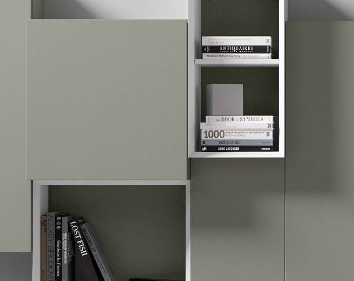 Composizione da L 270 x P 45 x H 190 cm con moduli pensili a battente e cassetto laccato opaco fumo, moduli a giorno laccato opaco bianco con schiena laccato opaco fumo.