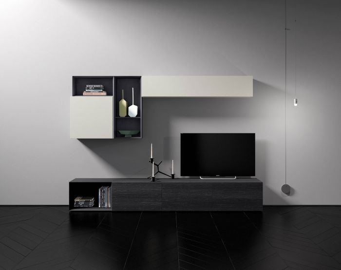 Composizione da L 270 x P 45 x H 191 cm con modulo battente laccato opaco nuvola, moduli ribalta laccato opaco nuvola e rovere grigio, moduli a giorno rovere grigio.