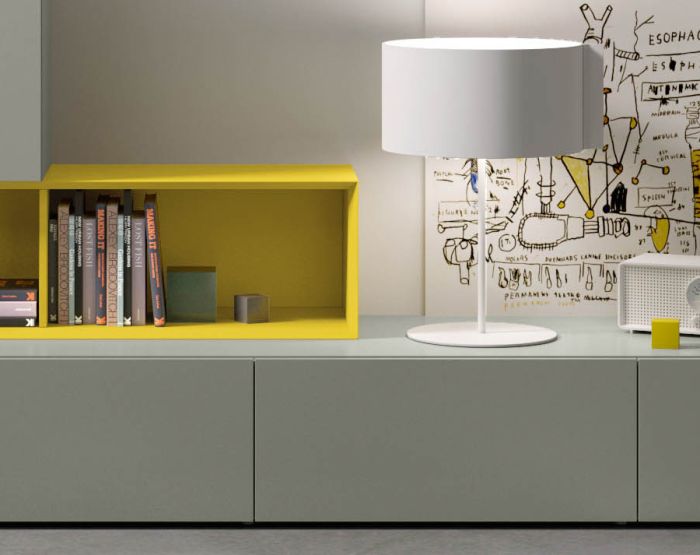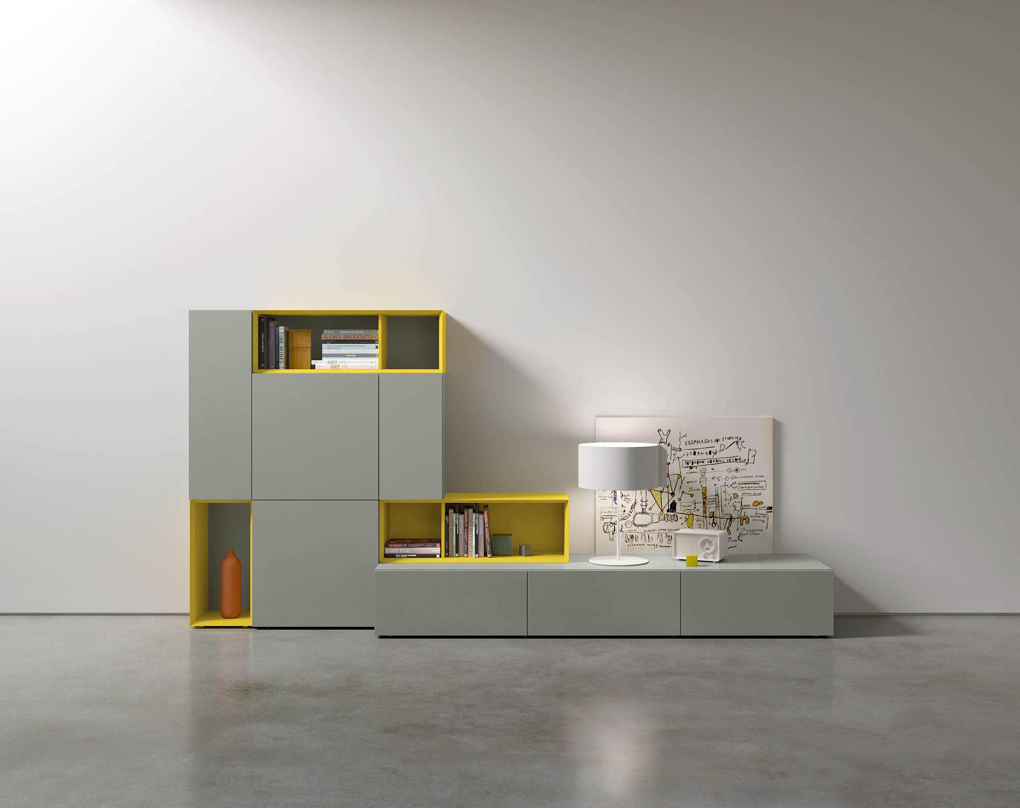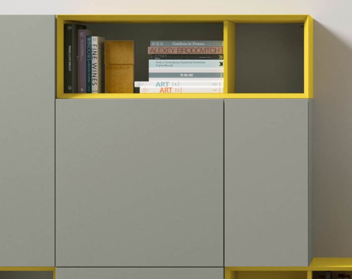 Composizione da L 300 x P 55 x H 151 cm con moduli battente e ribalta laccato opaco fumo, moduli a giorno laccato opaco zafferano con schiena laccato opaco zafferano e fumo.