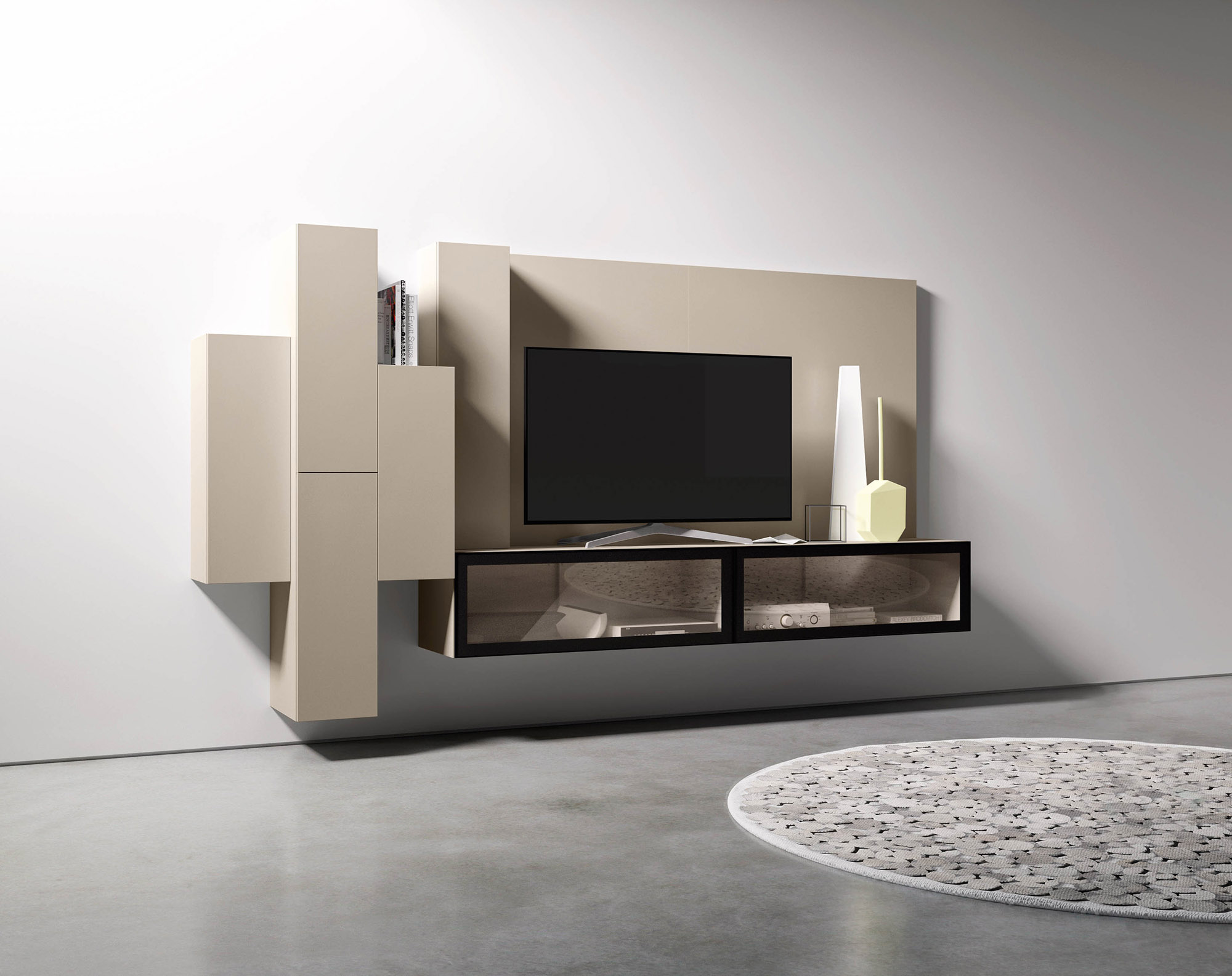 Composizione da L 330 x P 45 x H 200 cm con moduli con struttura laccato opaco tortora frontali battente laccato opaco e lucido tortora, frontali ribalta telaio con vetro stopsol, boiserie laccato opaco tortora.