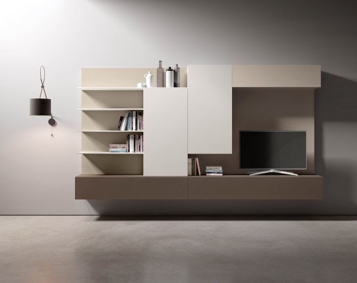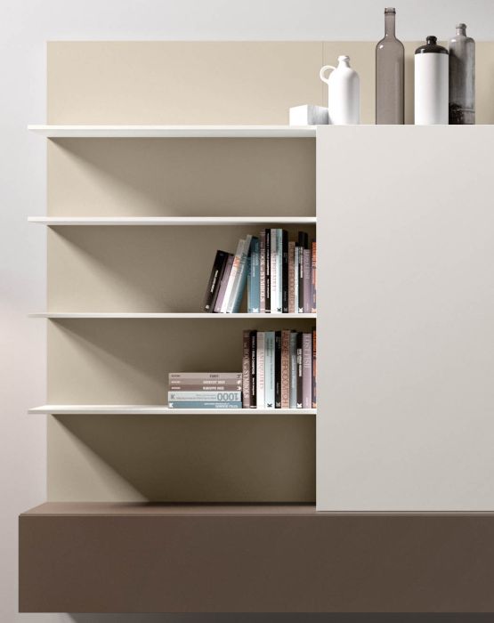 Composizione da L 330 x P 45 x H 210 cm con moduli battente laccato opaco bianco, moduli ribalta laccato opaco tortora e cappuccino, boiserie laccato opaco tortora con mensole laccato opaco bianco.