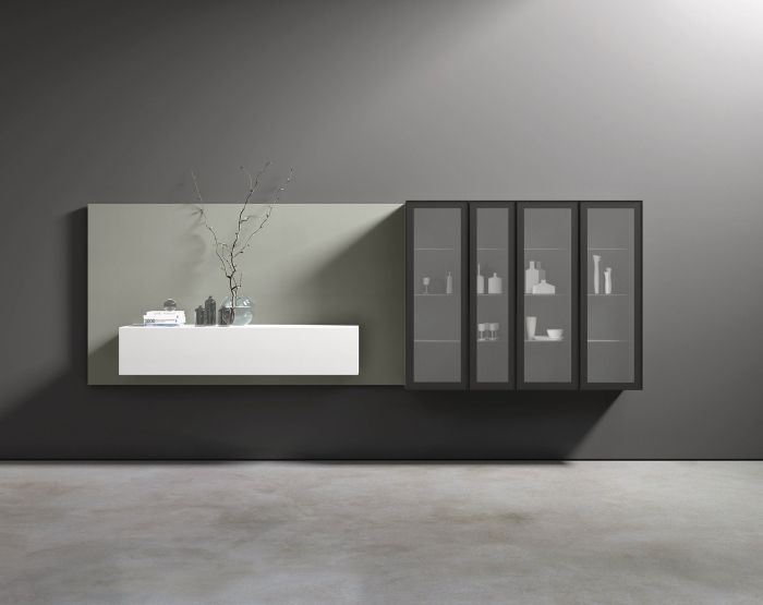 Composizione da L 360 x P 40 x H 165 cm con moduli con struttura laccato opaco fumo, frontali battente telaio con vetro fumè satinato, modulo ribalta laccato opaco bianco, boiserie laccato opaco fumo.