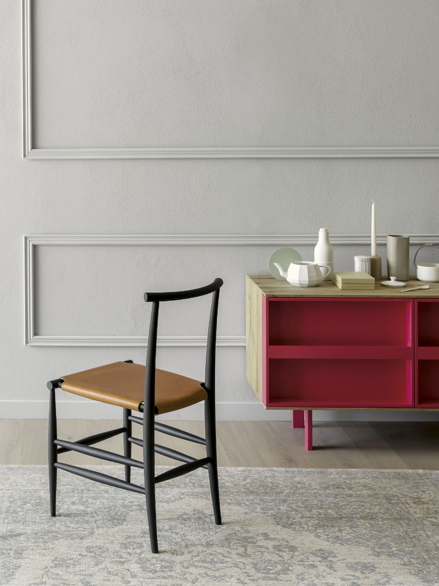 Pelleossa è una sedia eclettica, slanciata, che esprime il suo carattere nei dettagli. Si ispira alle sedie italiane di epoca preindustriale inserendo l’atteggiamento dell’arte concettuale. Disponibile anche con i braccioli, si completa con le diverse combinazioni della seduta.