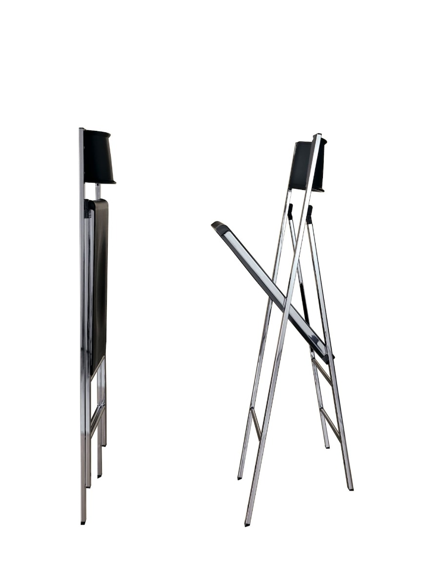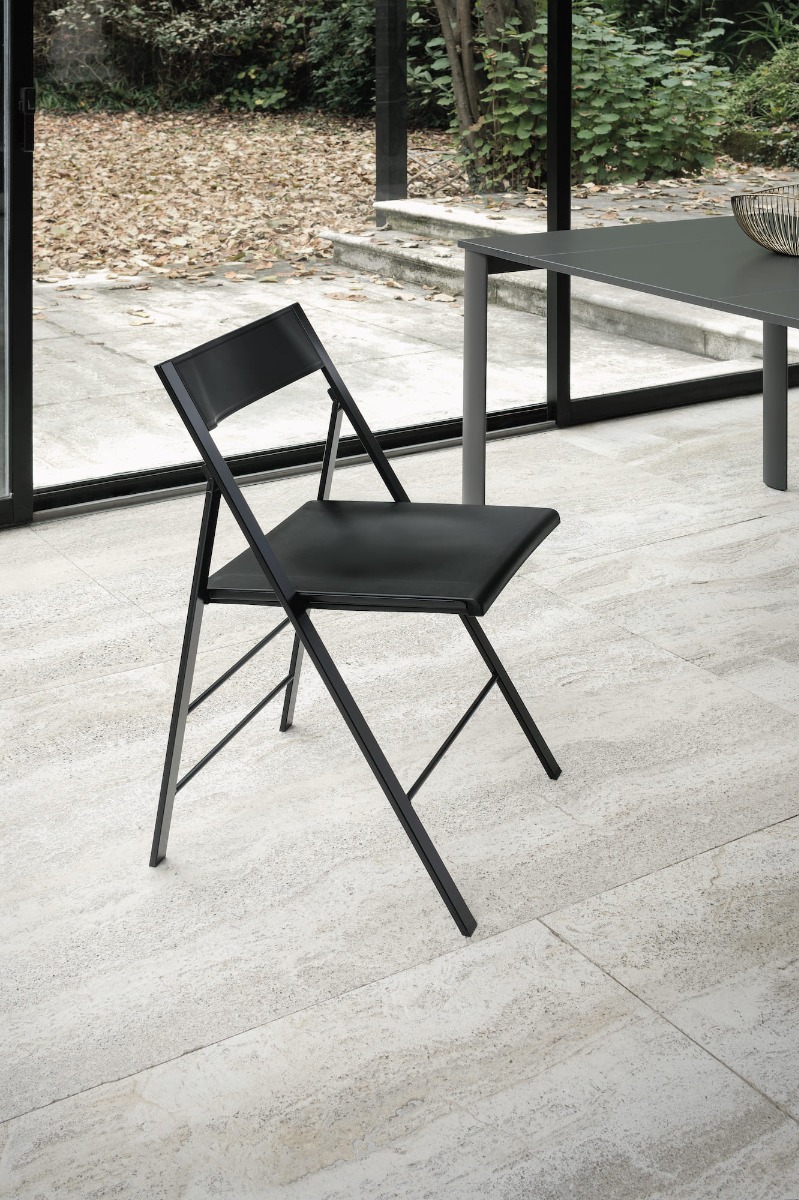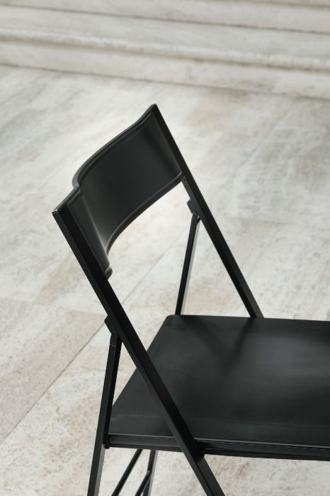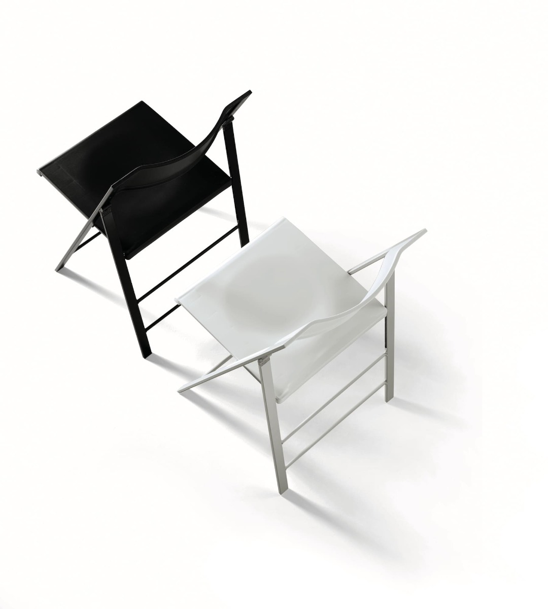 Sedia pieghevole con struttura in acciaio laccato o cromato, con schienale e seduta disponibili in diversi colori.