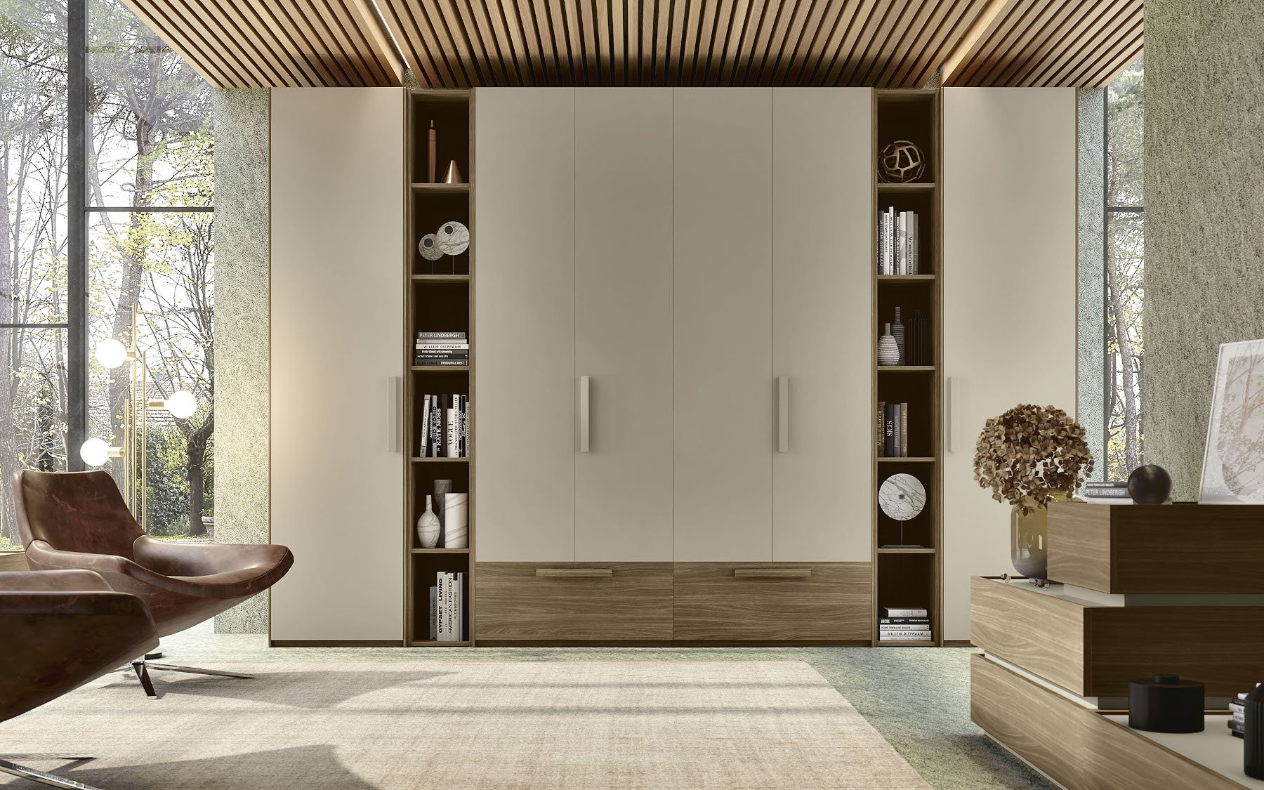 La collezione Prodigi offre un sistema d'arredo completo e coordinato per l'intera zona notte: dai letti dal design ricercato agli armadi estremamente capienti, fino ai gruppi notte composti da comodini, comò e settimanali. Ogni elemento è progettato per dialogare armoniosamente, permettendo di configurare una camera matrimoniale "total look" dove funzionalità e coerenza estetica si incontrano in ogni dettaglio.