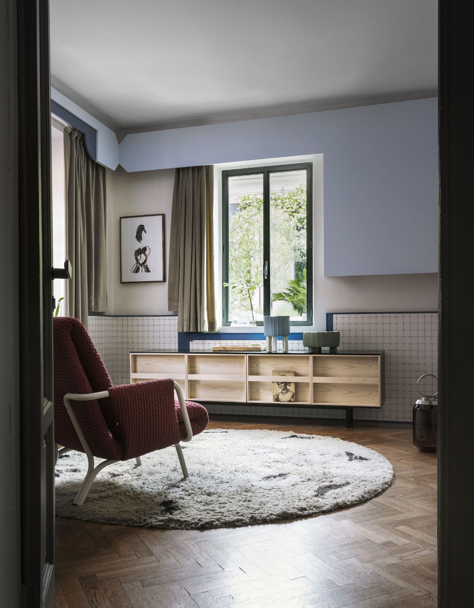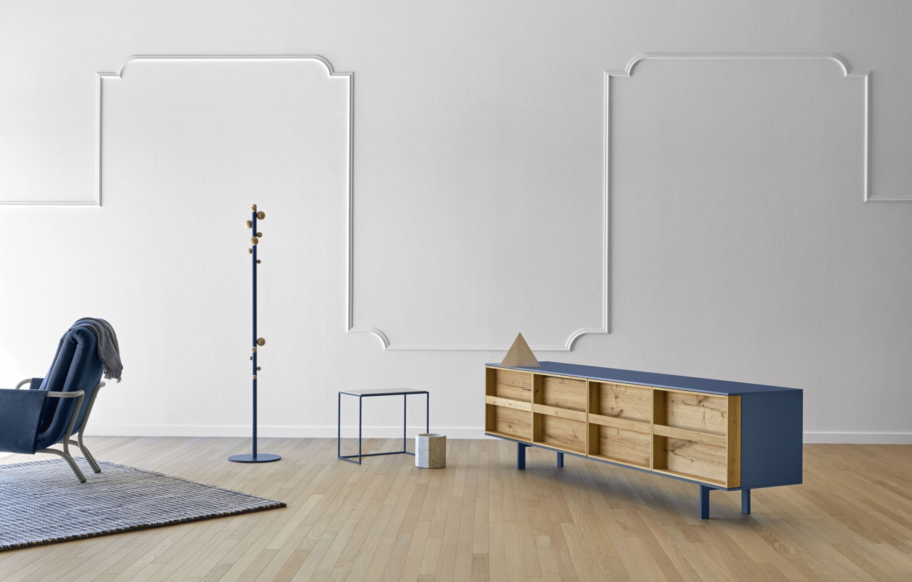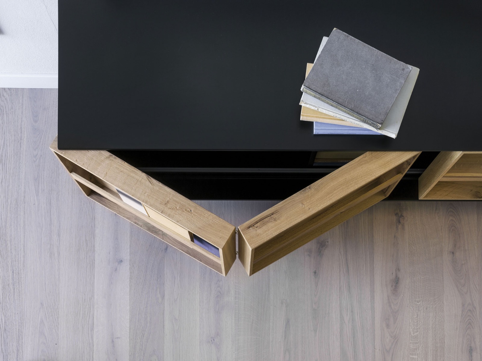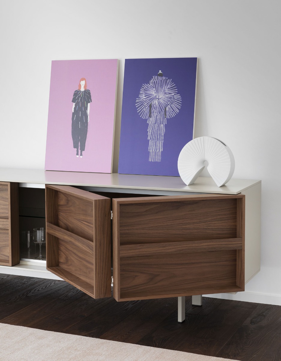 Suggestiva, con sottili linee di legno e dal fascino minimalista. La madia si caratterizza da ante pensate come libreria e dotate di un efficace sistema di apertura a libro.