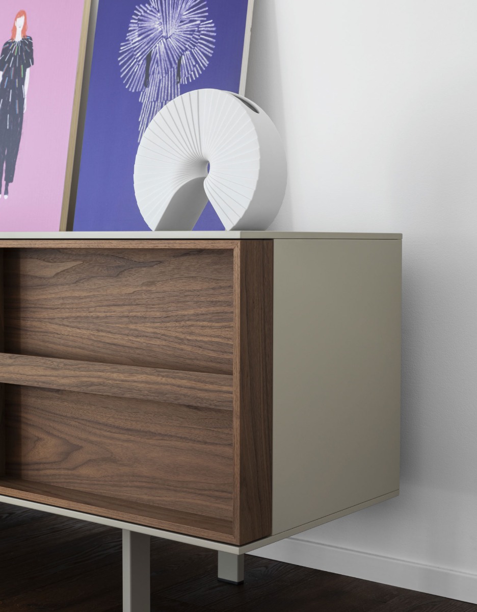 Madia disponibile in diverse dimensioni, con base e struttura laccate. Ante con apertura a libro, in essenza di legno o laccate negli stessi colori della struttura.