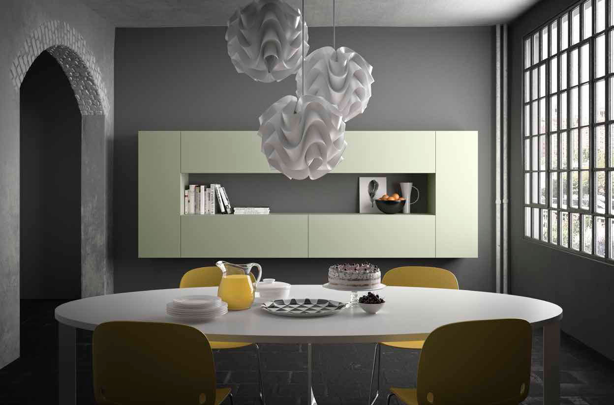 Composizione da L 320 x P 45 x H 180 cm con moduli con anta battente e moduli con anta ribalta. Finitura laccato opaco timo.