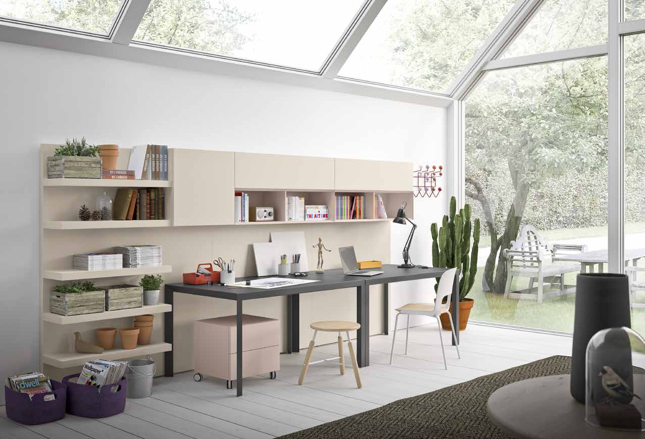 Composizione da L 390 x P 35 x H 181 cm con moduli con anta battente, ribalta, cassetto, vani a giorno e boiserie. Finitura laccato opaco tortora e laccato opaco ninfea.