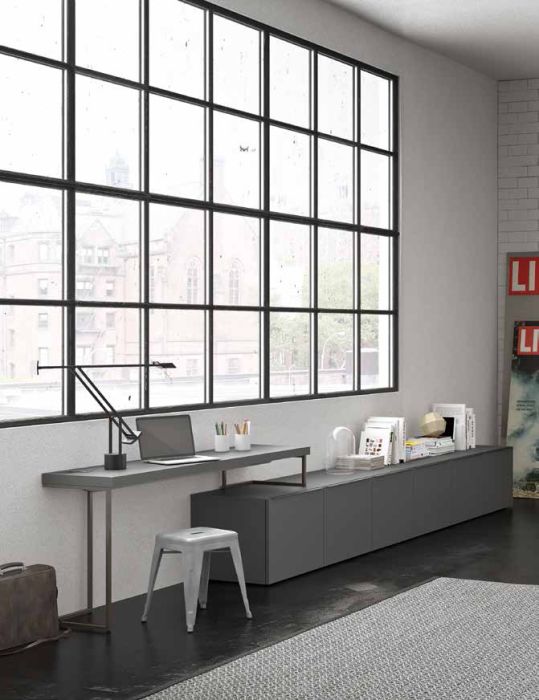 Composizione da L 480 x P 55 x H 76 cm con moduli con anta battente e scrittoio. FInitura laccato opaco piombo, maniglia Y finitura titanio e basamento scrittoio finitura titanio.