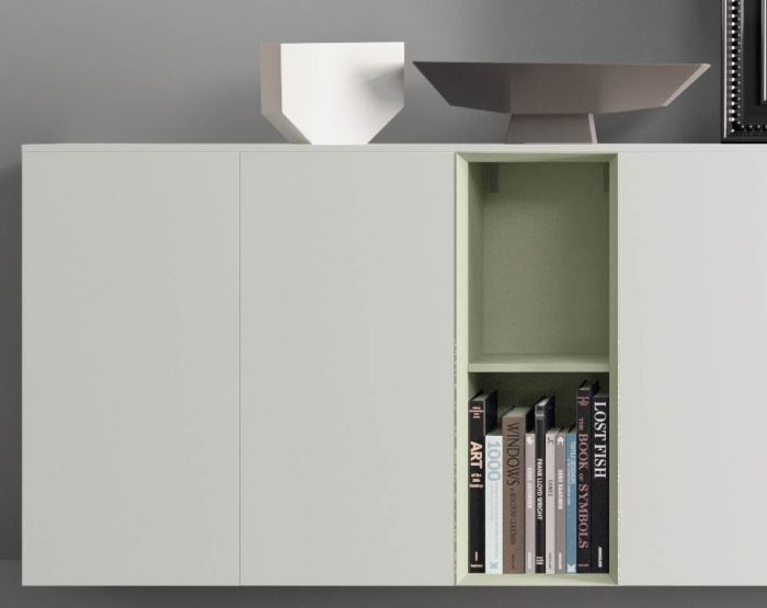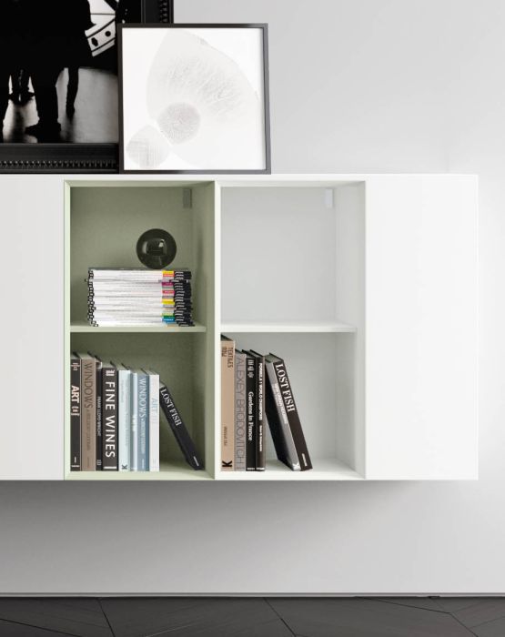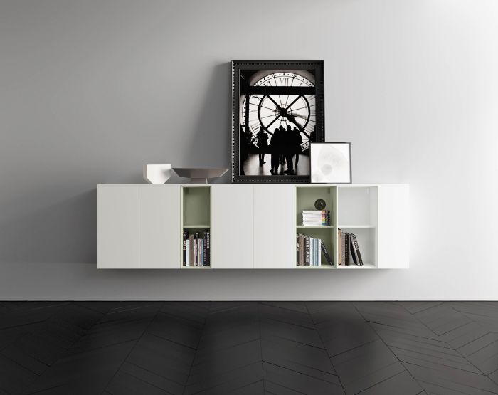 Composizione da L 300 x P 35 x H 120 cm con moduli battente laccato opaco bianco, moduli a giorno laccato opaco bianco e timo, top laccato opaco bianco.